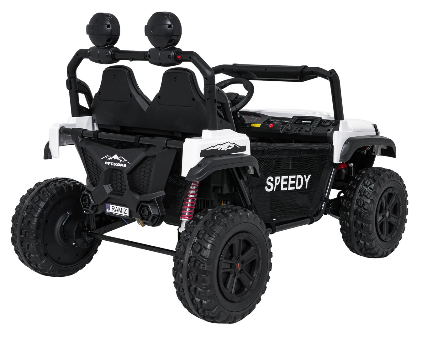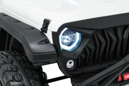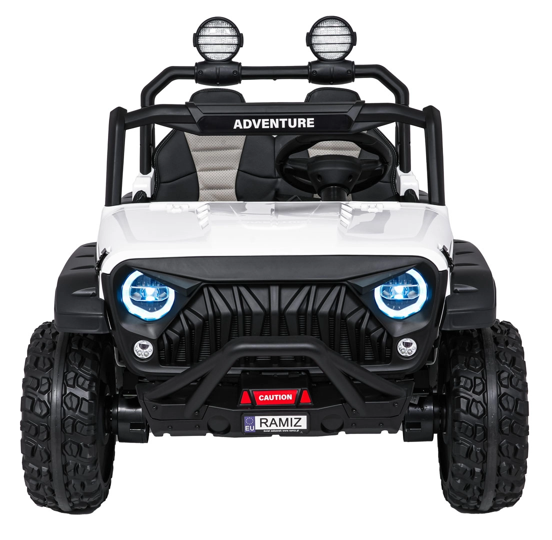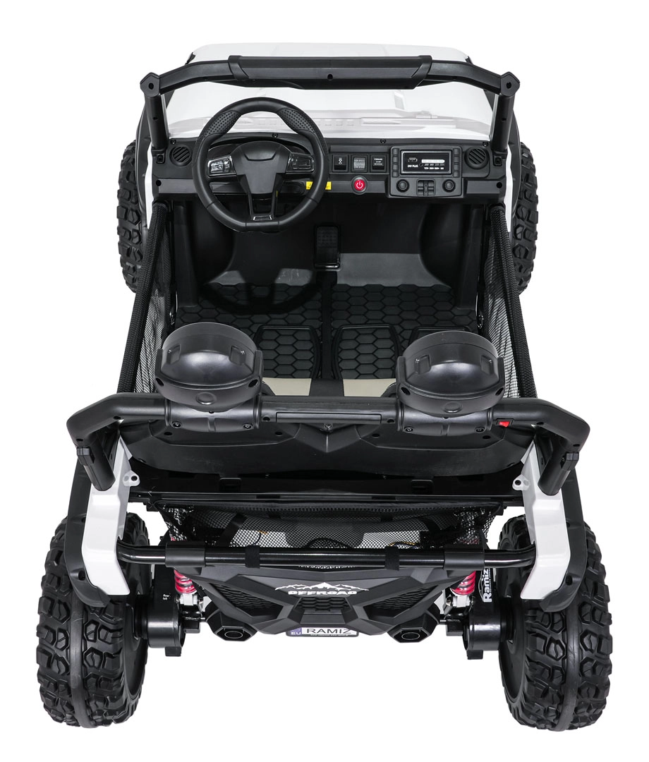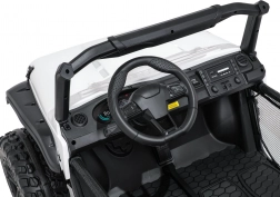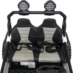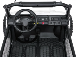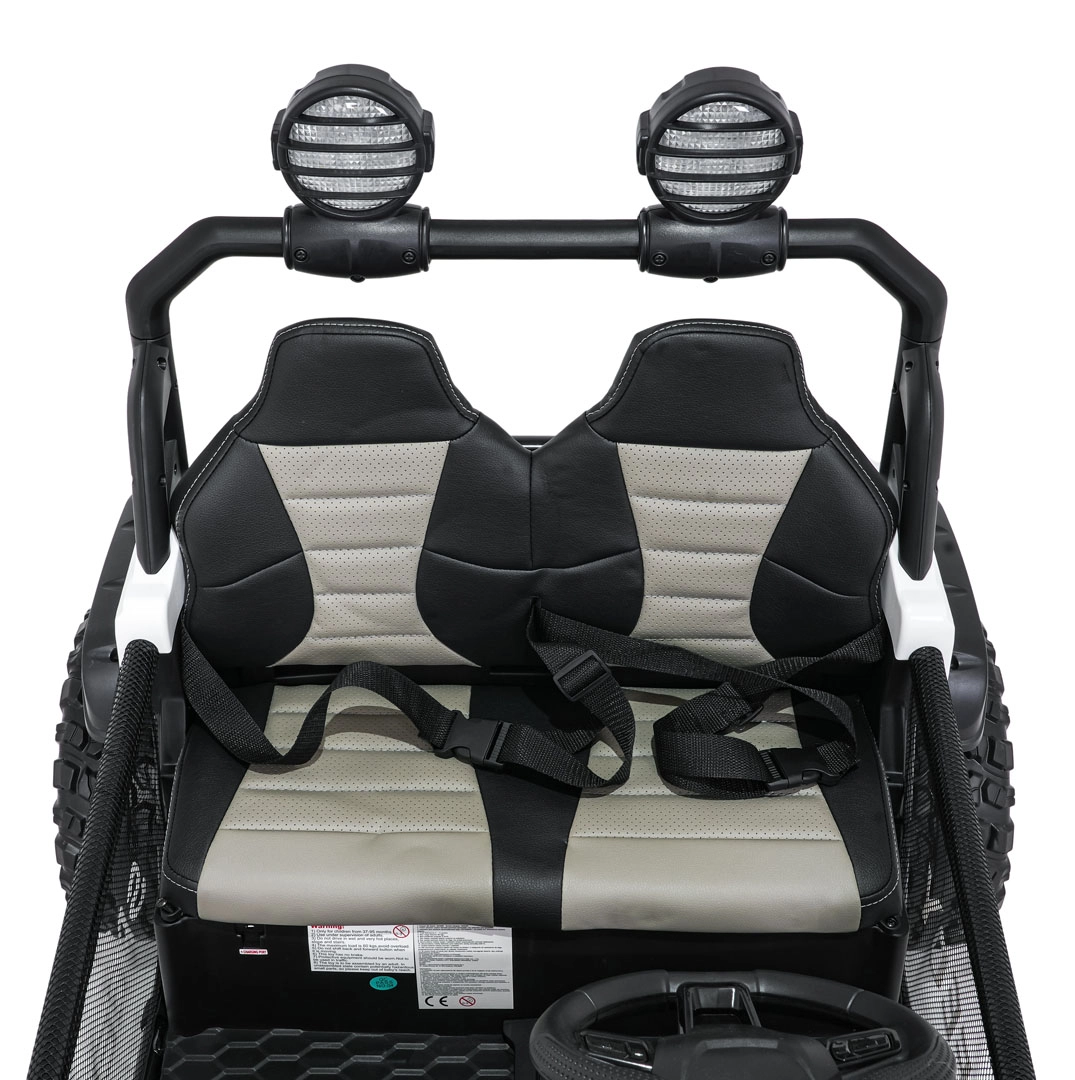 Jonge bestuurders genieten van de rijke uitrusting: multimediapaneel met MP3/USB/AUX en Bluetooth, geluiden en claxon op het stuur, LED-koplampen en verlichte motorkap. Ouders waarderen de 2,4 GHz afstandsbediening met 3 snelheden, soft start en noodstop. De tweepersoons eco-leren stoel met gordels verhoogt comfort en veiligheid.