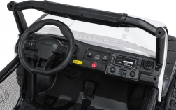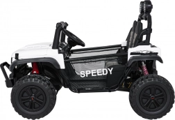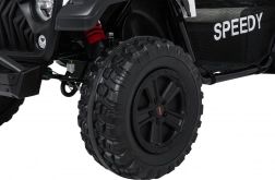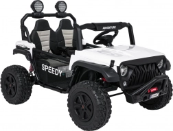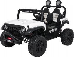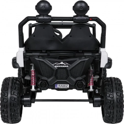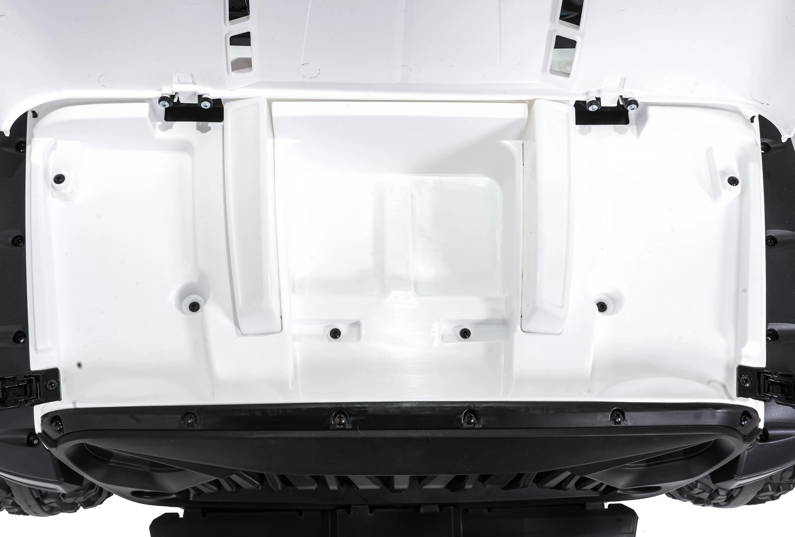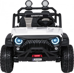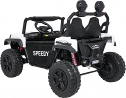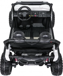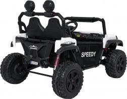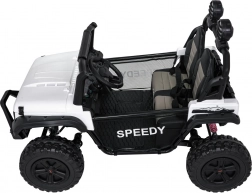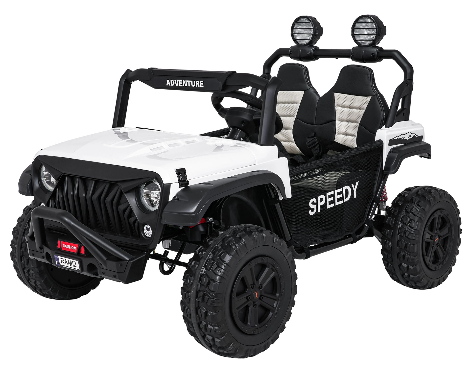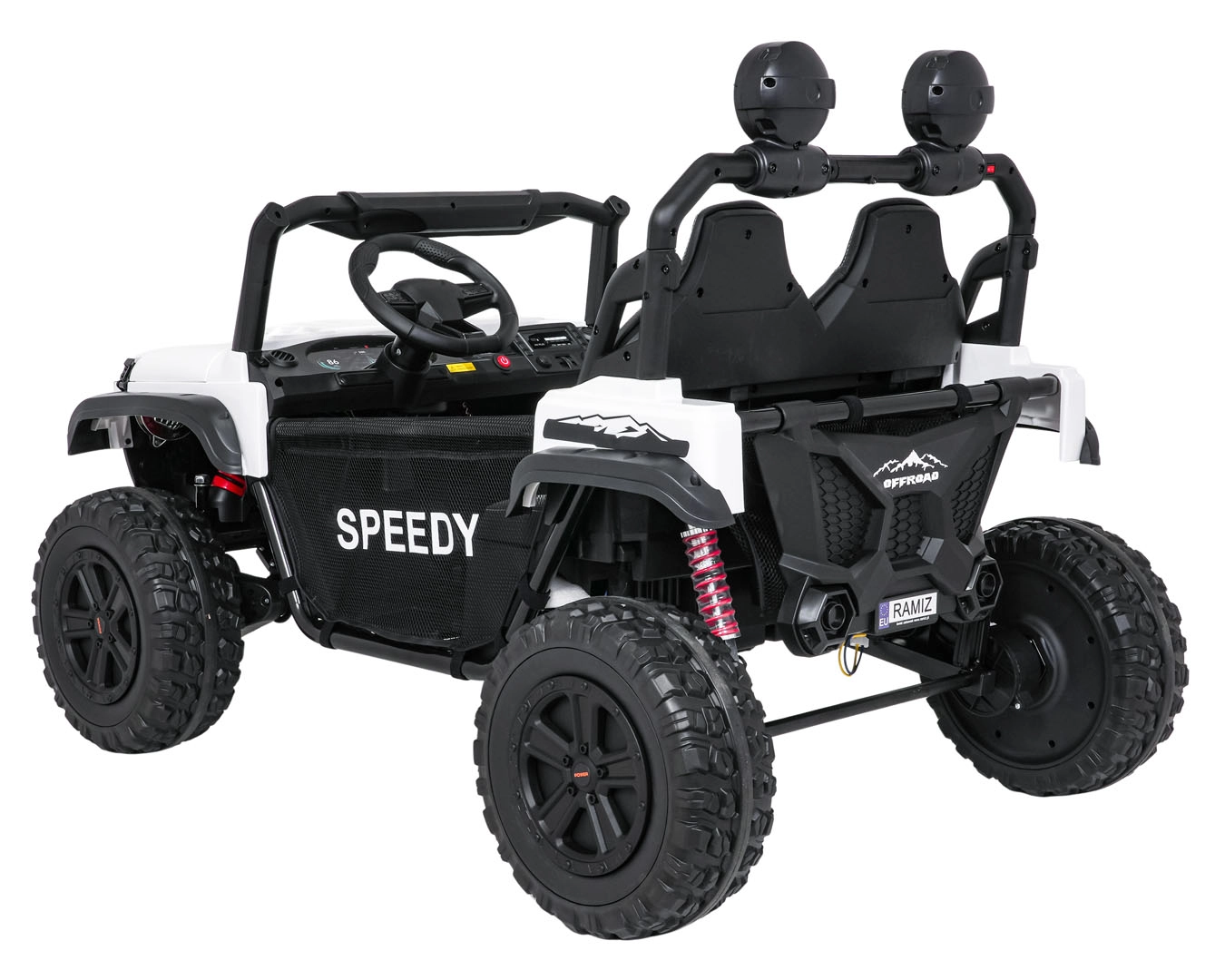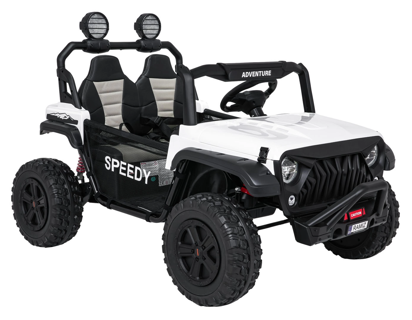 Jonge bestuurders genieten van de rijke uitrusting: multimediapaneel met MP3/USB/AUX en Bluetooth, geluiden en claxon op het stuur, LED-koplampen en verlichte motorkap. Ouders waarderen de 2,4 GHz afstandsbediening met 3 snelheden, soft start en noodstop. De tweepersoons eco-leren stoel met gordels verhoogt comfort en veiligheid.