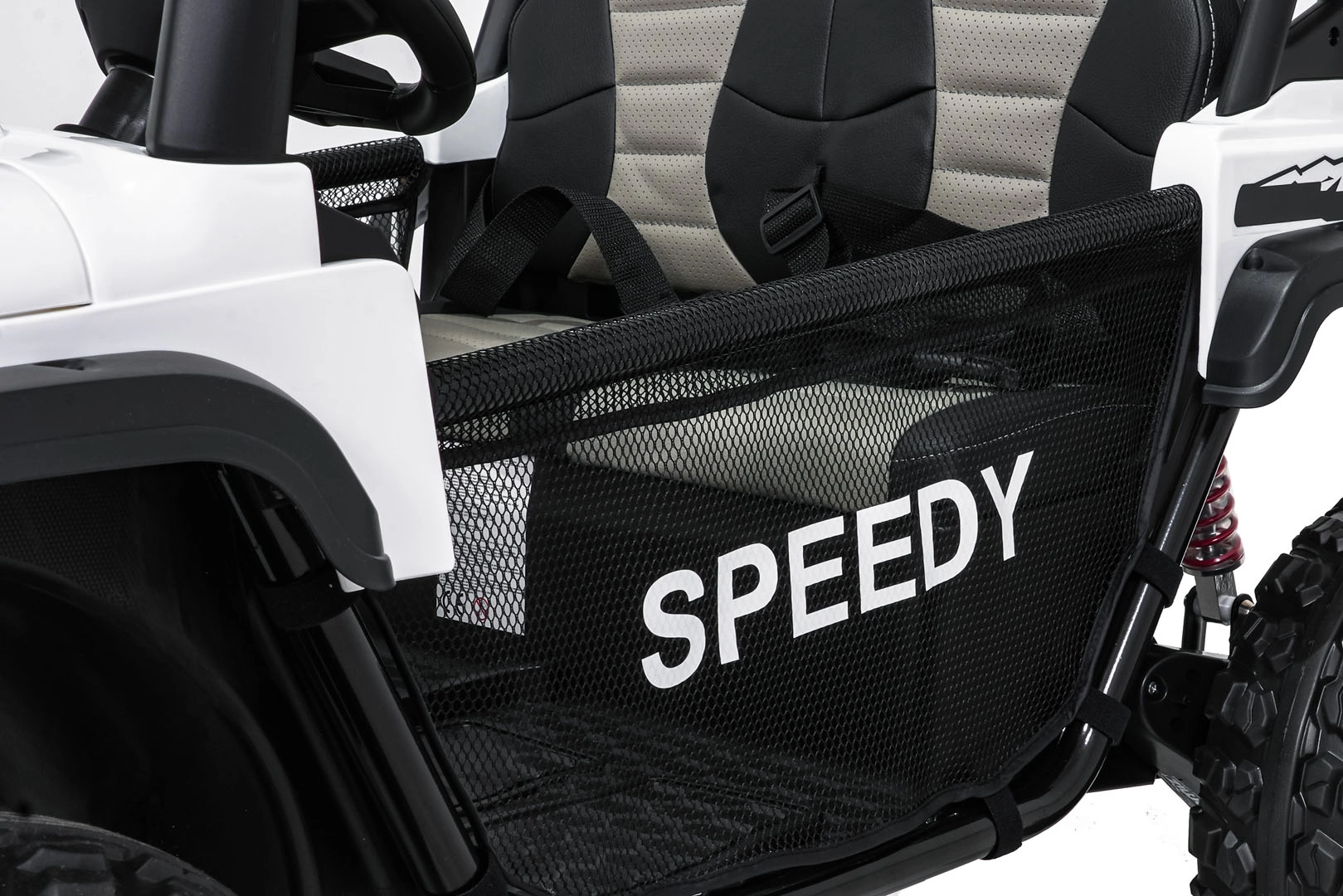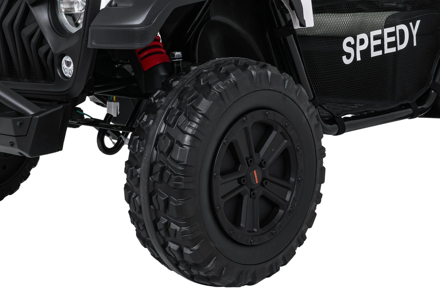 Robuuste elektrische kinderterreinwagen PASSION 4x4 met 4 motoren van 200 W, een 24 V batterij, EVA-schuimbanden en een tweepersoons zitplaats van eco-leer met gordels. Dankzij LED-verlichting, soepel wegrijden en een 2,4 GHz afstandsbediening met noodstop is rijden leuk én veilig.