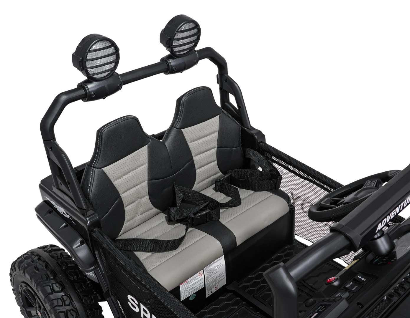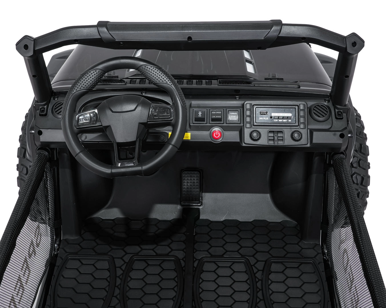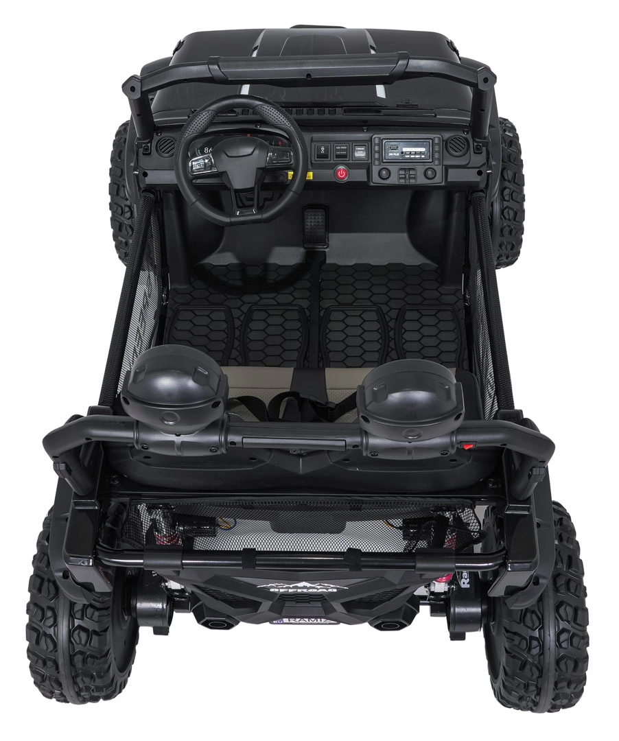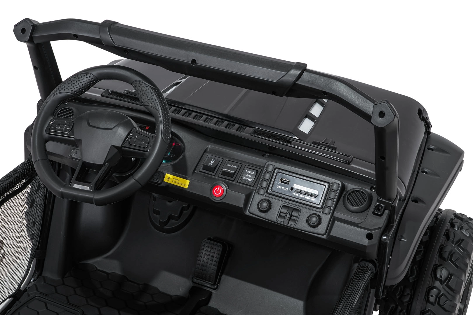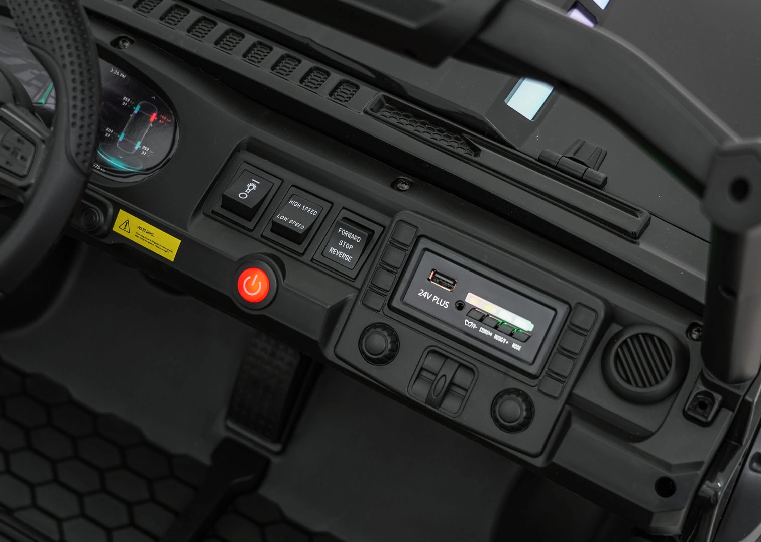 Het interieur met dubbele stoel van eco-leer, veiligheidsgordels en een overzichtelijk dashboard biedt ruimte voor twee kinderen. Rijke LED-verlichting (voorlichten, verlichte motorkap en voorbereiding voor een bovenste lichtframe op batterijen) zorgt voor stijl en zichtbaarheid. Het multimediale paneel met USB/AUX/MP3/Bluetooth en claxonknoppen op het stuur zorgt voor vermaak onderweg.