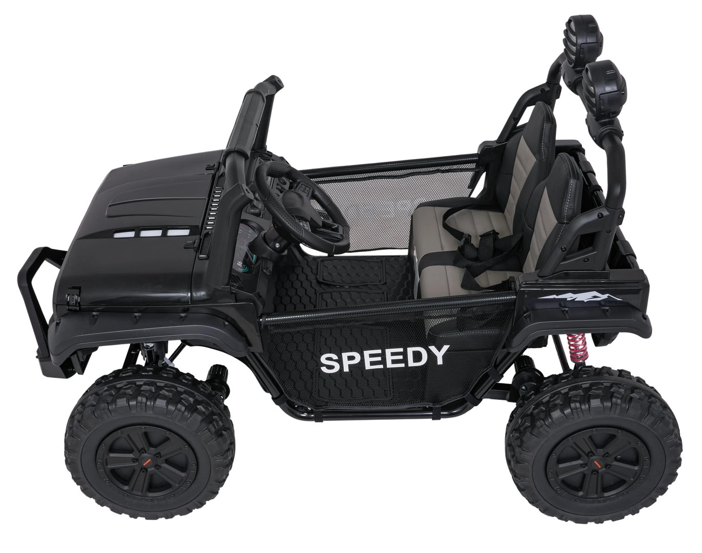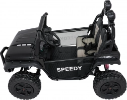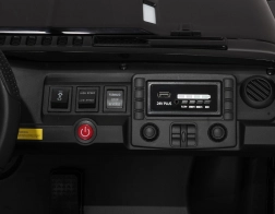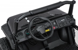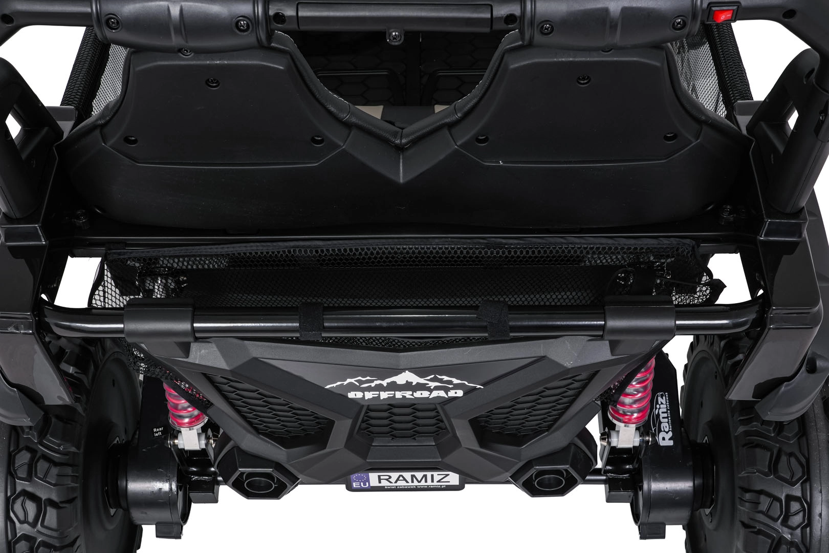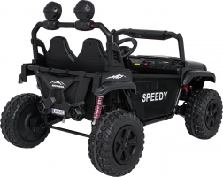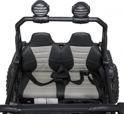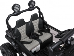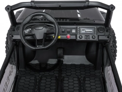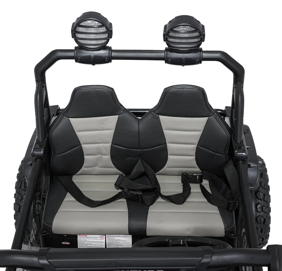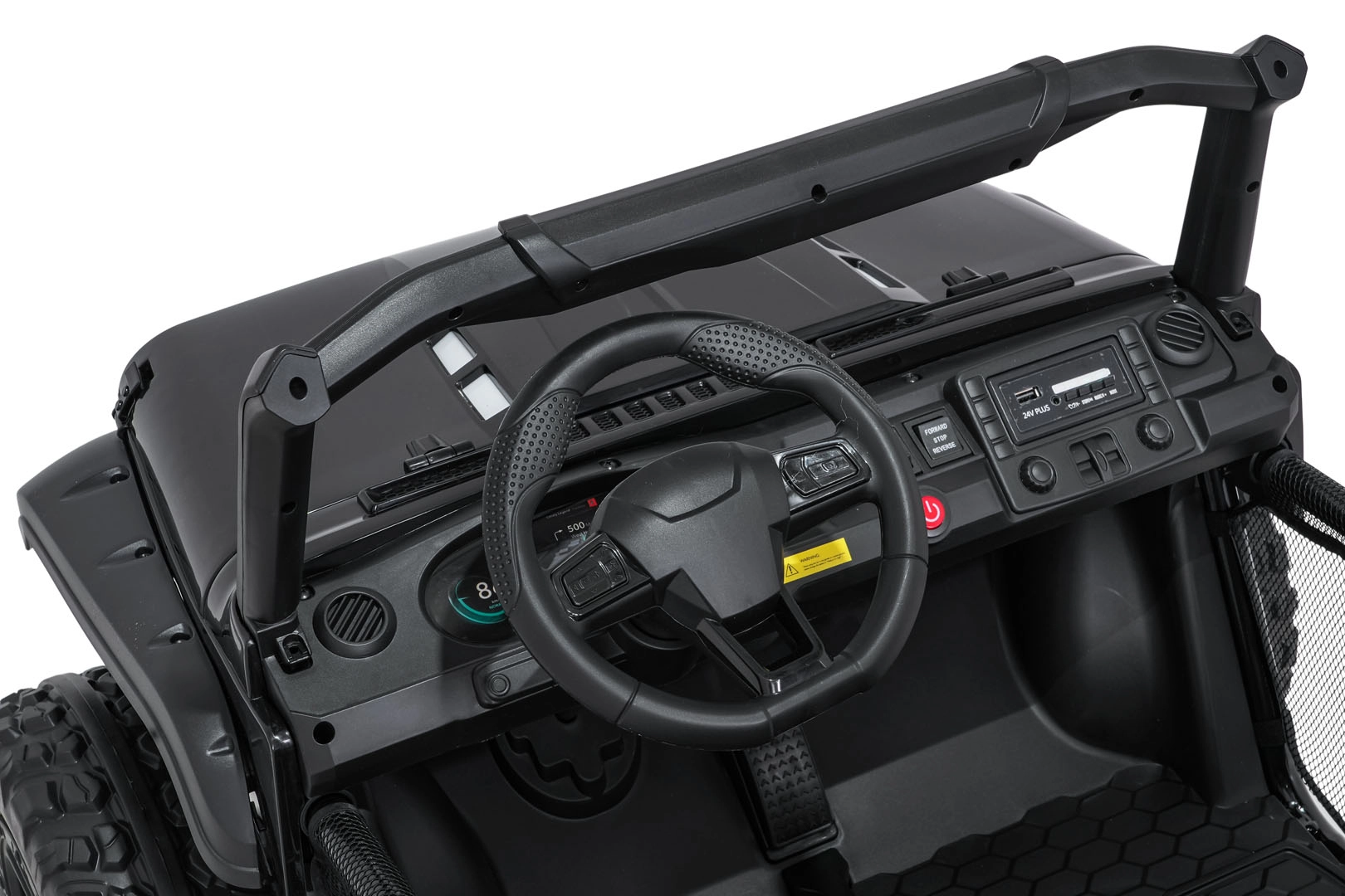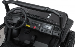 Het interieur met dubbele stoel van eco-leer, veiligheidsgordels en een overzichtelijk dashboard biedt ruimte voor twee kinderen. Rijke LED-verlichting (voorlichten, verlichte motorkap en voorbereiding voor een bovenste lichtframe op batterijen) zorgt voor stijl en zichtbaarheid. Het multimediale paneel met USB/AUX/MP3/Bluetooth en claxonknoppen op het stuur zorgt voor vermaak onderweg.