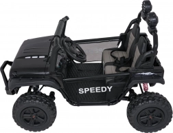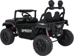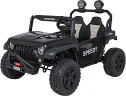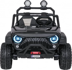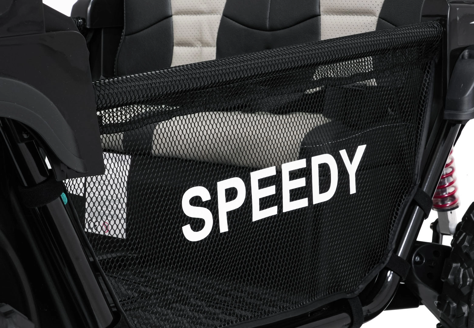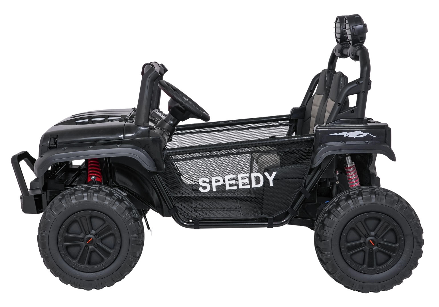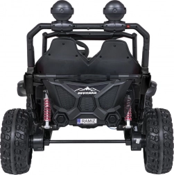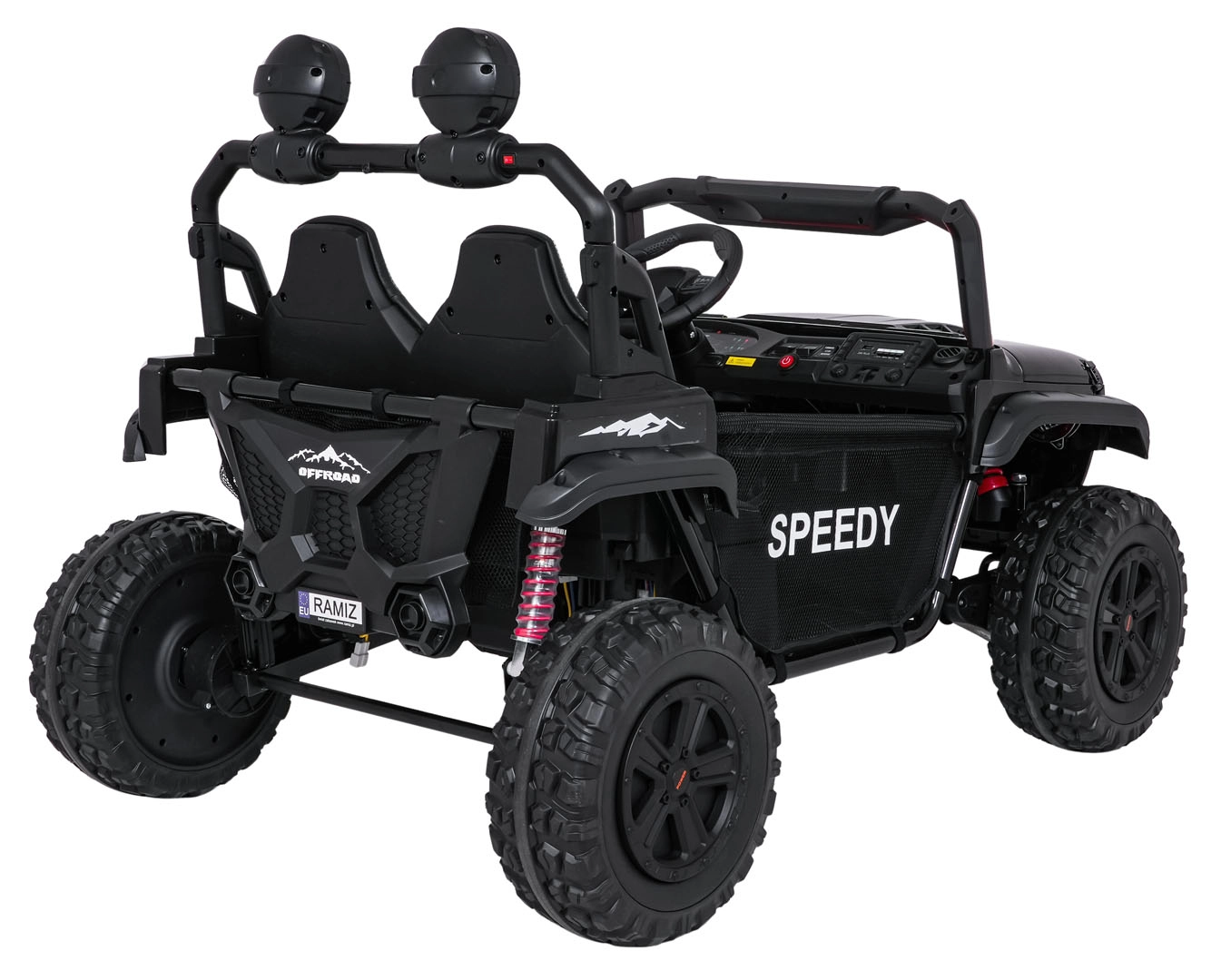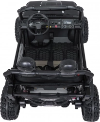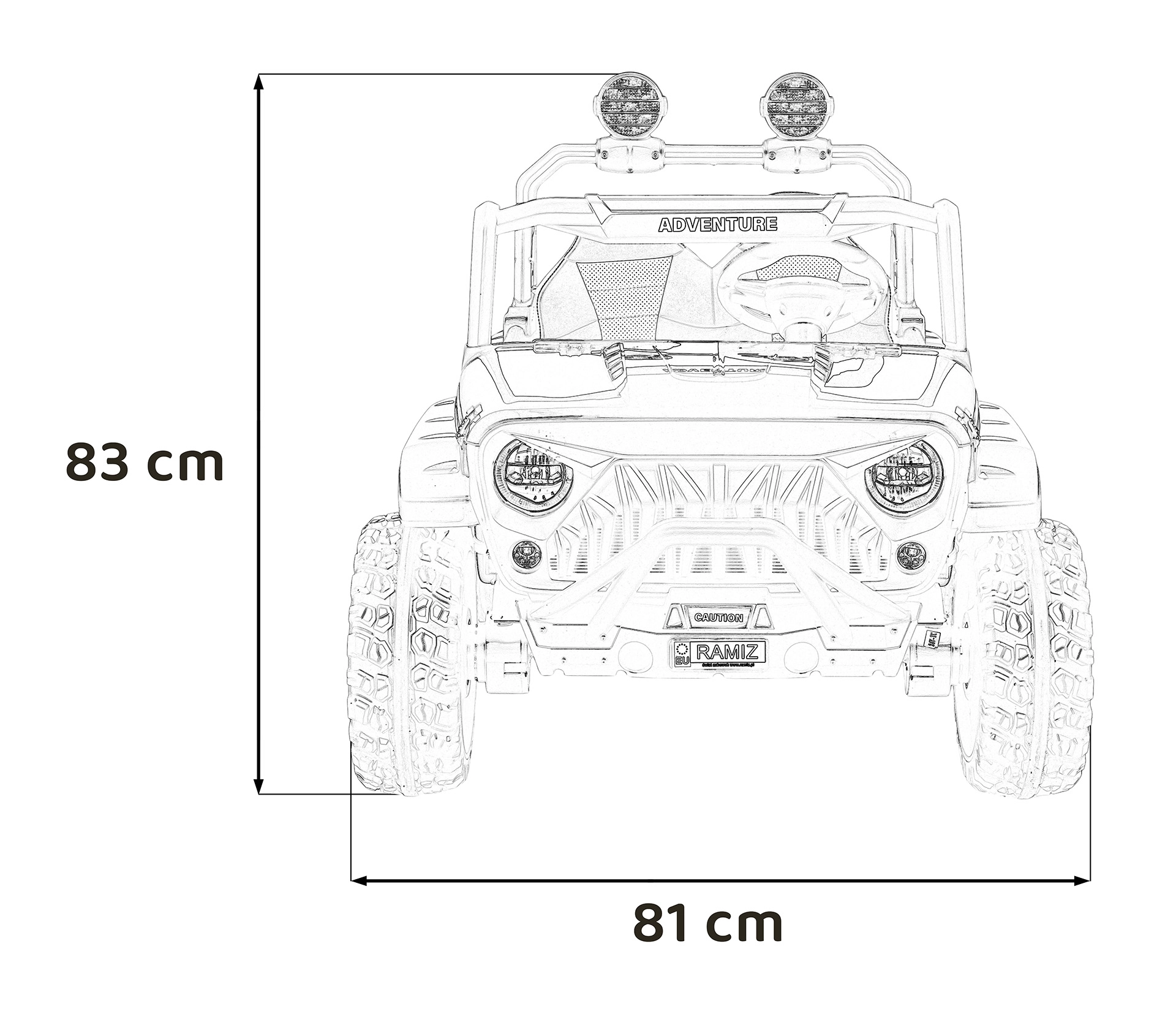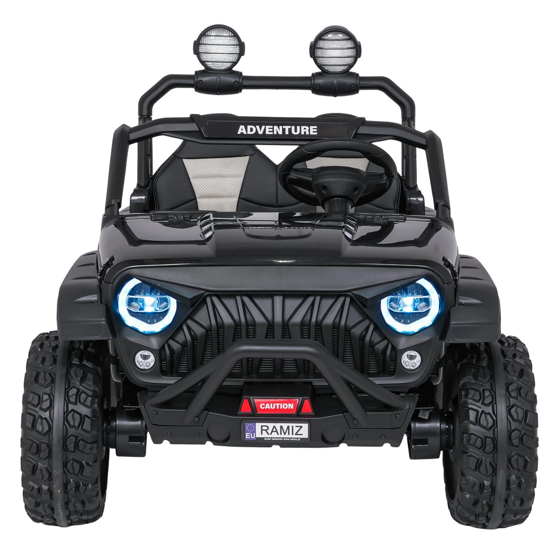 Het interieur met dubbele stoel van eco-leer, veiligheidsgordels en een overzichtelijk dashboard biedt ruimte voor twee kinderen. Rijke LED-verlichting (voorlichten, verlichte motorkap en voorbereiding voor een bovenste lichtframe op batterijen) zorgt voor stijl en zichtbaarheid. Het multimediale paneel met USB/AUX/MP3/Bluetooth en claxonknoppen op het stuur zorgt voor vermaak onderweg.