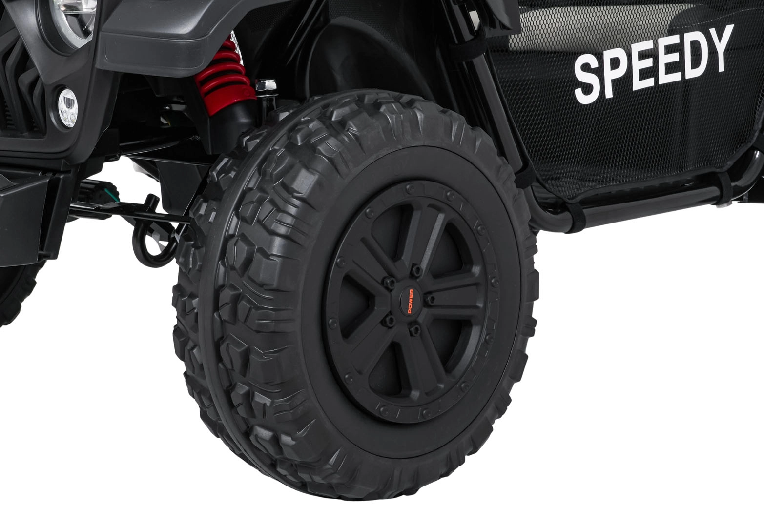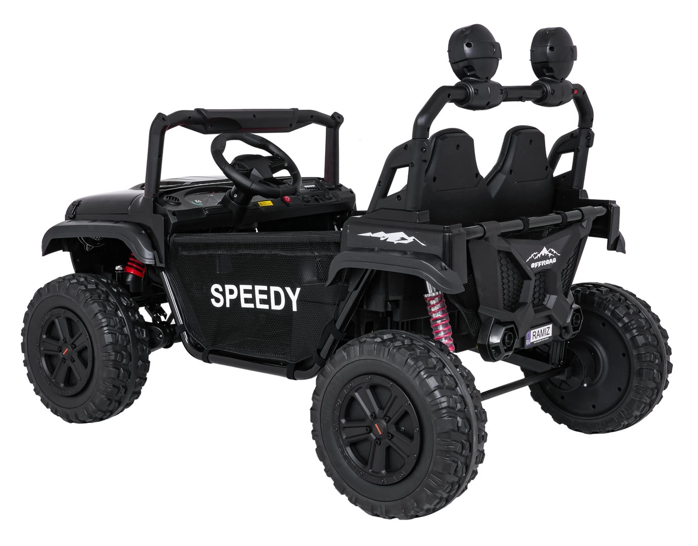 Ouders zullen de 2,4 GHz afstandsbediening waarderen met drie snelheden en de veiligheidstoets Stop. De praktische achterste box 49 × 10 × 16 cm biedt plaats aan kleine spullen voor een uitje. De laadindicator bewaakt de energie van de twee accu’s 12 V 10 Ah die in serie zijn geschakeld (24 V).