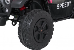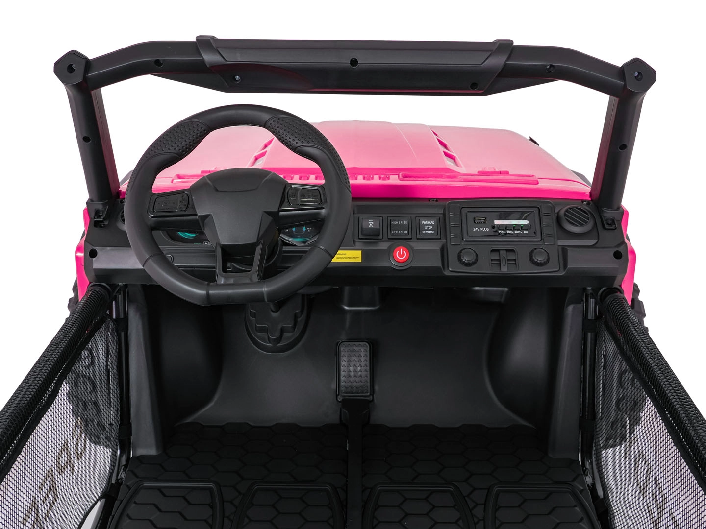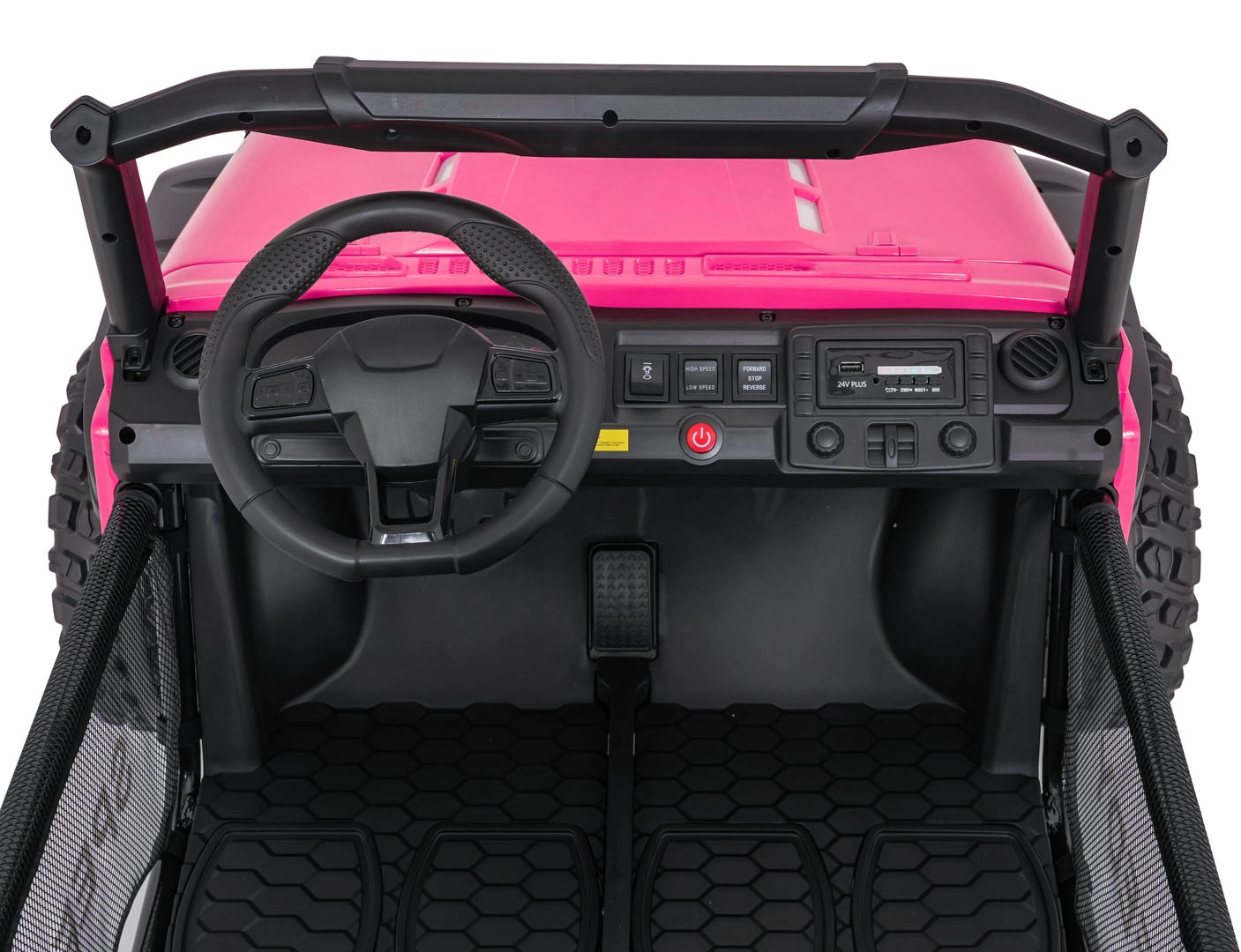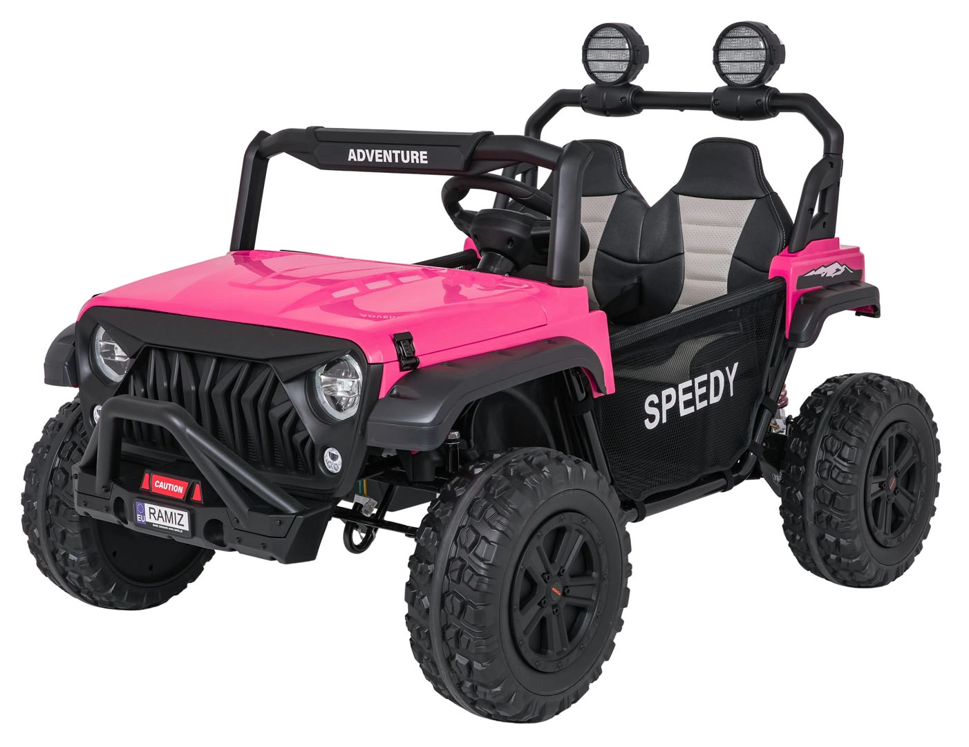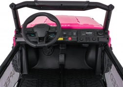 Ouders waarderen de 2,4 GHz afstandsbediening met drie snelheden en de Stop-veiligheidsknop. Kinderen genieten van muziek – het paneel biedt Bluetooth, MP3, USB en AUX, plus een claxon en voorgeïnstalleerde melodieën. Uitgebreide verlichting met LED-lampen, verlichte motorkap en voorbereiding voor een bovenste lichtbalk geeft de auto een avontuurlijke uitstraling.