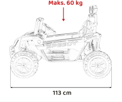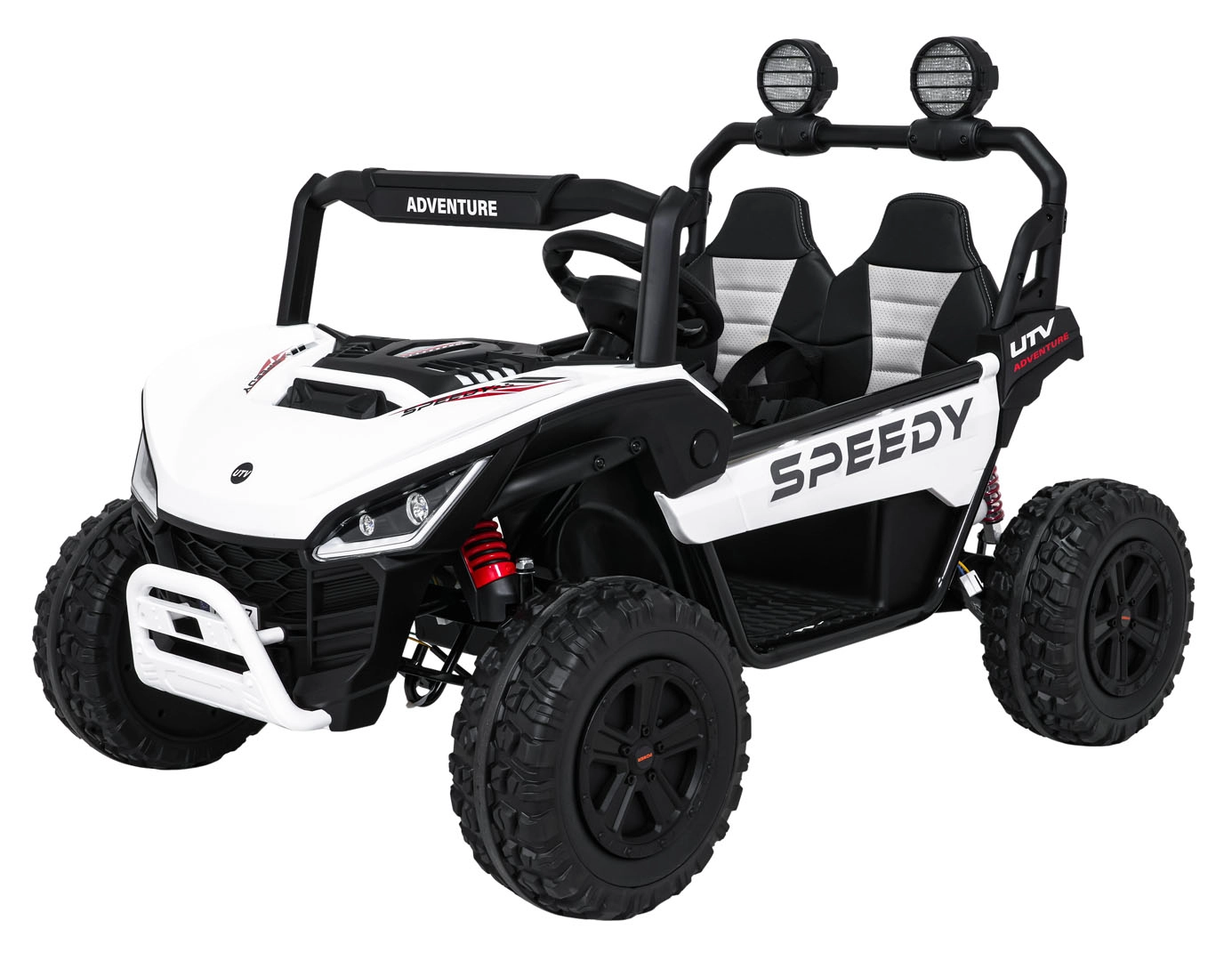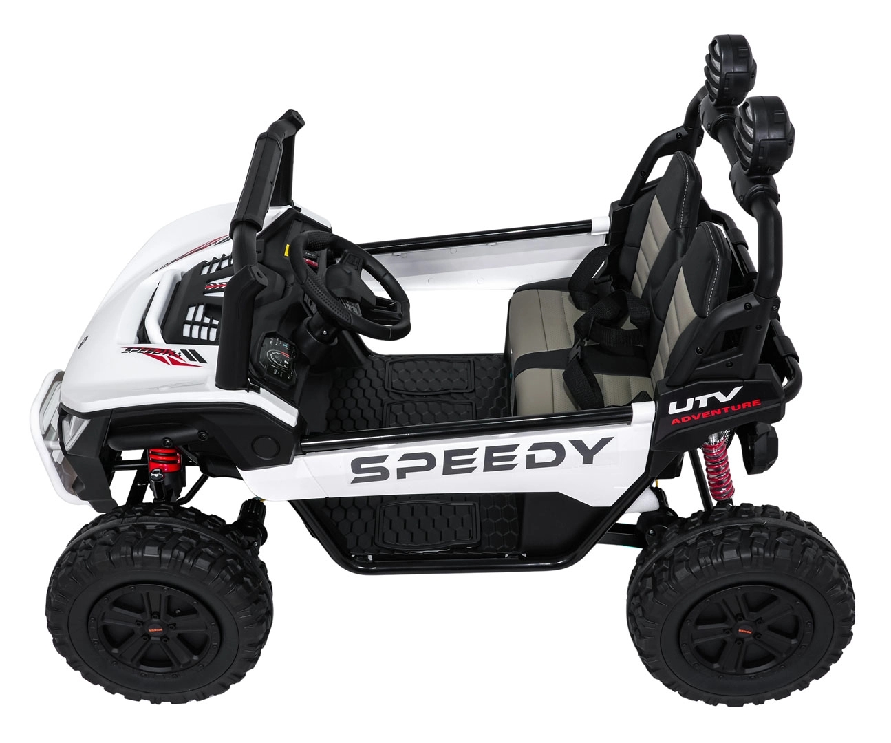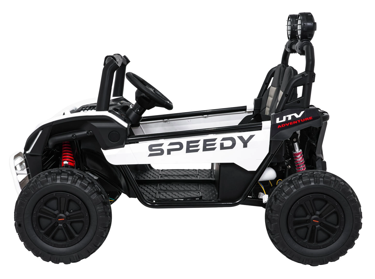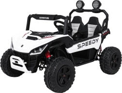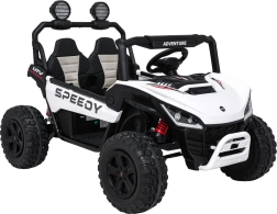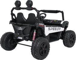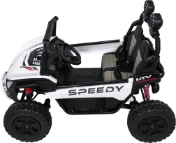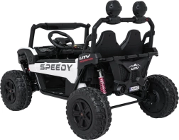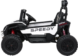 Deze robuuste kinderbuggy SPEEDY brengt echt offroad-avontuur. Vier sterke motoren van 4×200 W, gevoed door een 24 V set (2×12 V 10 Ah), zorgen voor een soepele start, twee snelheden en rijden vooruit/achteruit. Grote EVA-schuimbanden (31×12 cm), in combinatie met achterste verstelbare schokdempers en een hoge bodemvrijheid, bieden stabiliteit, grip en comfort op oneffen terrein.
