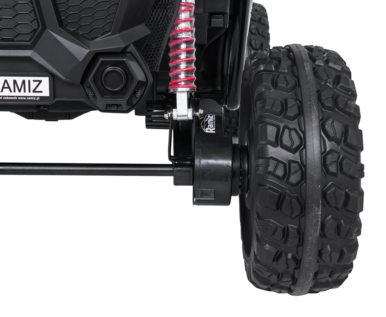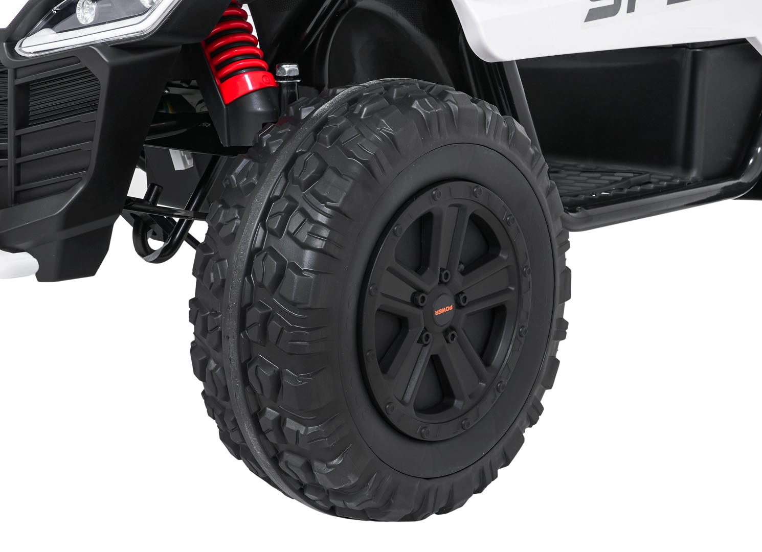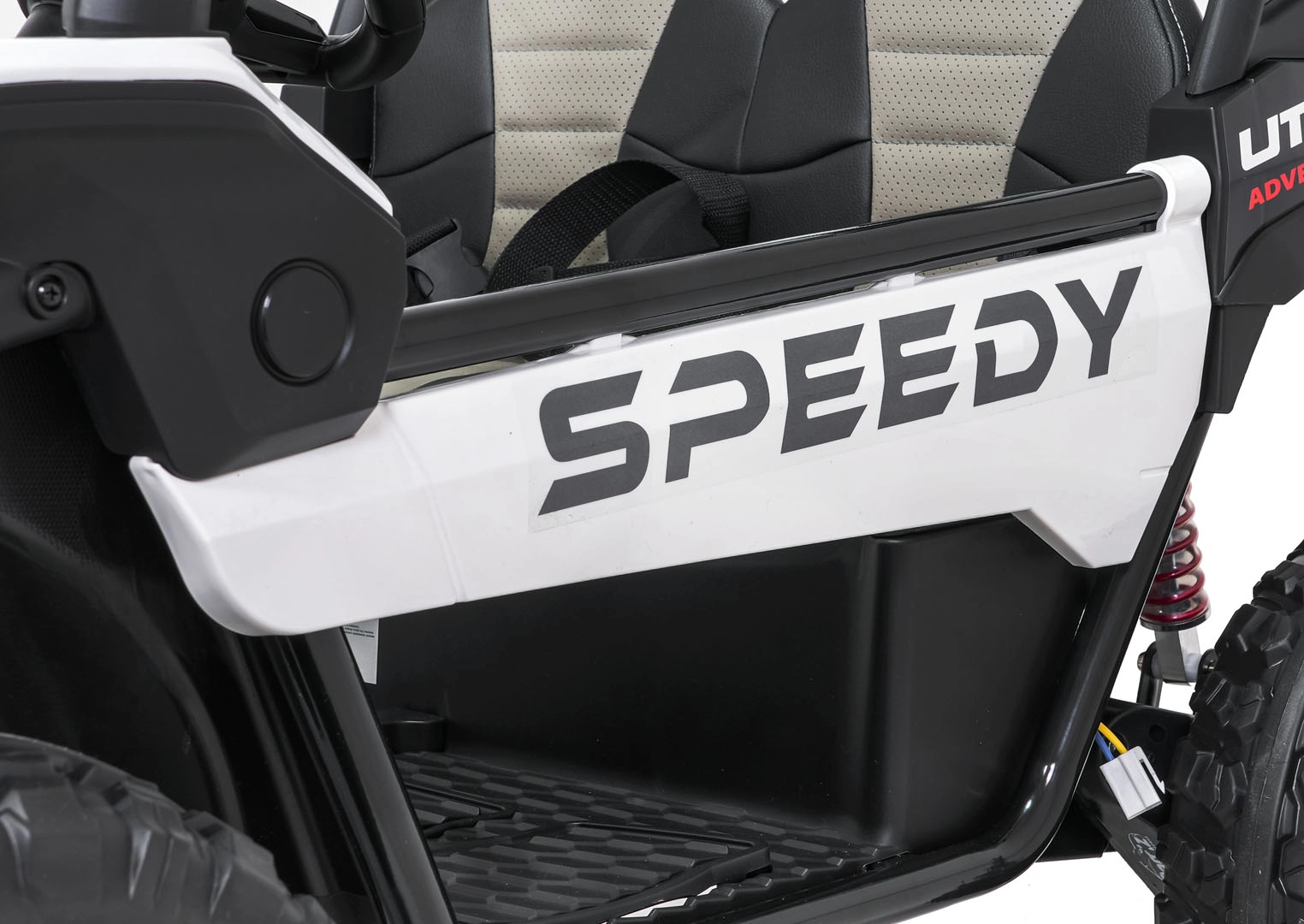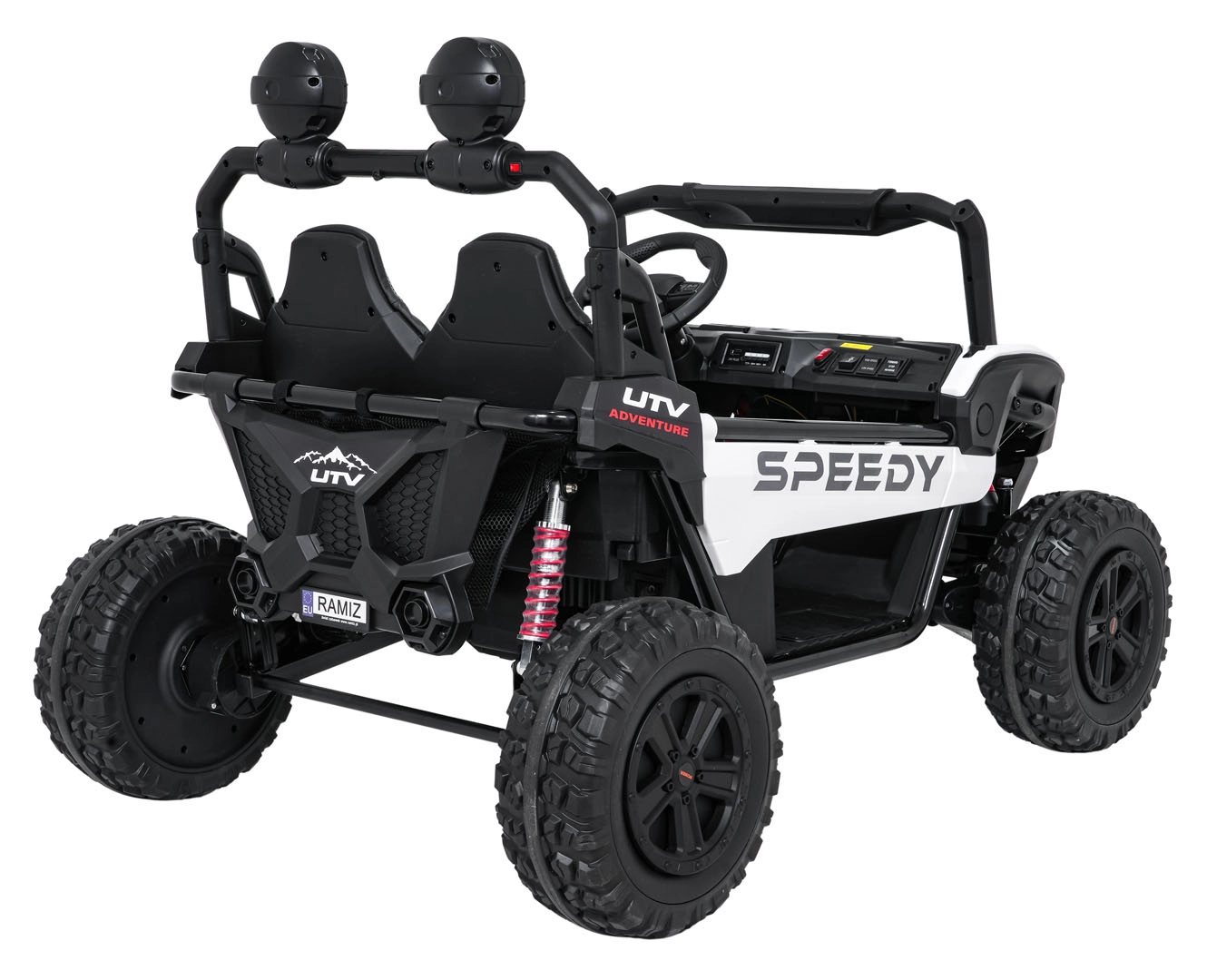 Deze robuuste kinderbuggy SPEEDY brengt echt offroad-avontuur. Vier sterke motoren van 4×200 W, gevoed door een 24 V set (2×12 V 10 Ah), zorgen voor een soepele start, twee snelheden en rijden vooruit/achteruit. Grote EVA-schuimbanden (31×12 cm), in combinatie met achterste verstelbare schokdempers en een hoge bodemvrijheid, bieden stabiliteit, grip en comfort op oneffen terrein.