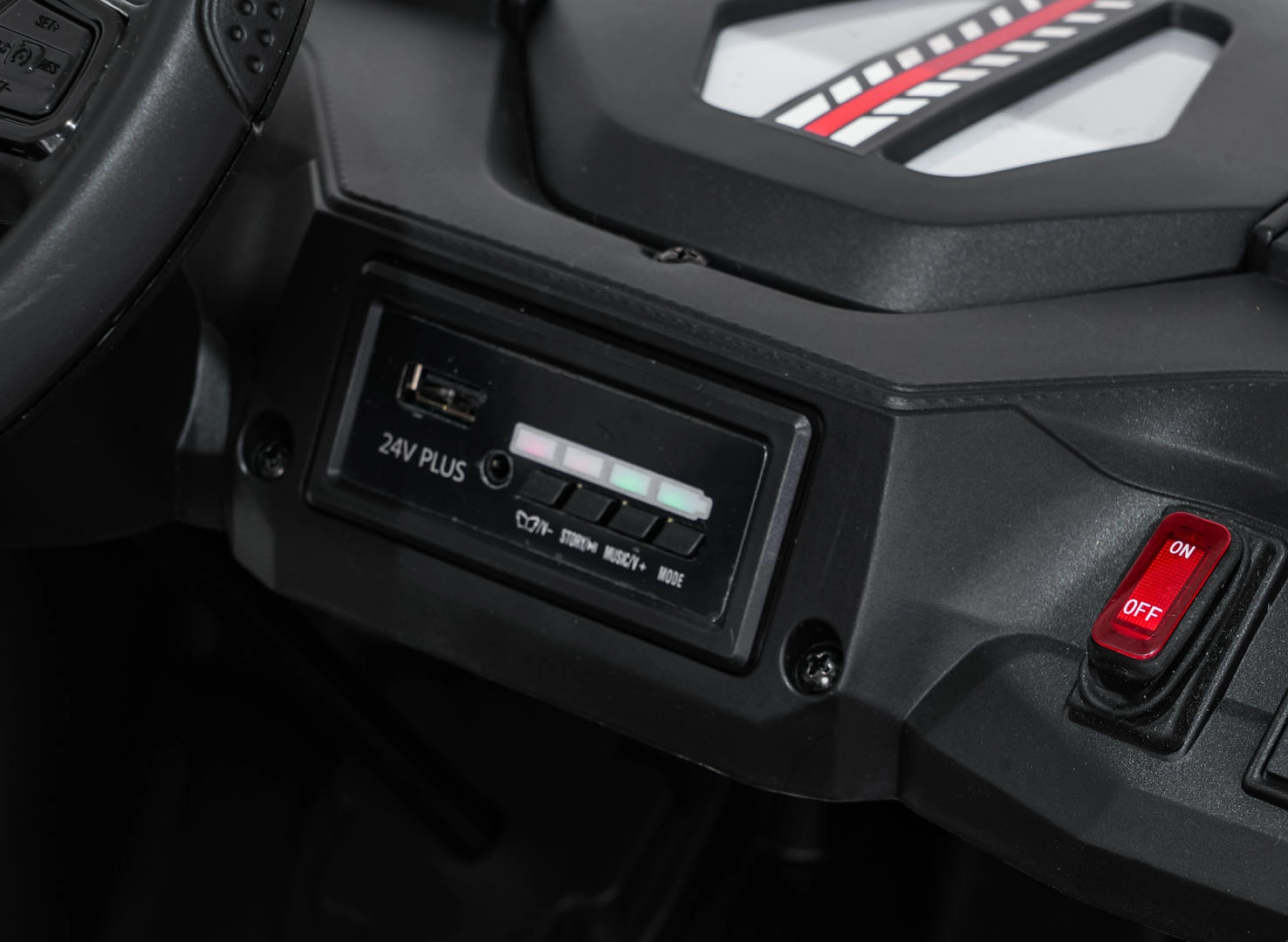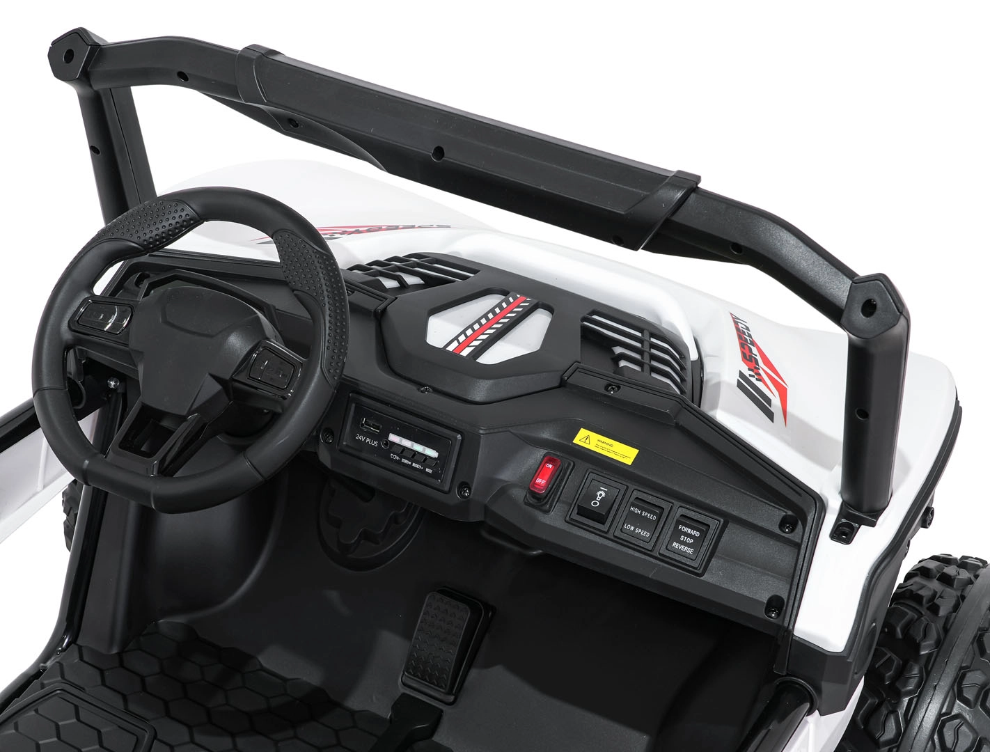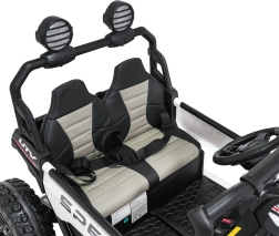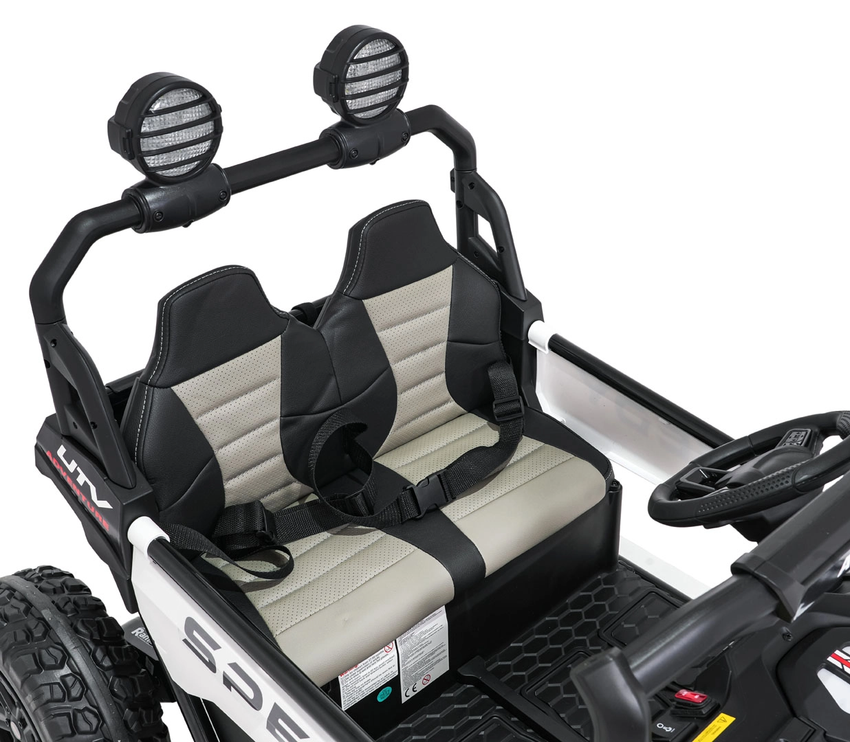 Veiligheid en comfort staan voorop: de ruime dubbele zitting van ecoleer met gordels biedt veilige zitplaats voor twee kinderen, de koplamp met LED-effect en de verlichte grille verhogen de zichtbaarheid. Ouders hebben alles onder controle dankzij de 2,4GHz afstandsbediening met 3 snelheden en Emergency Stop-functie. Het audiopaneel biedt MP3, AUX, USB en Bluetooth, inclusief claxon en melodieën op het stuur.
