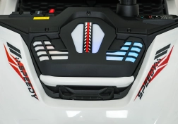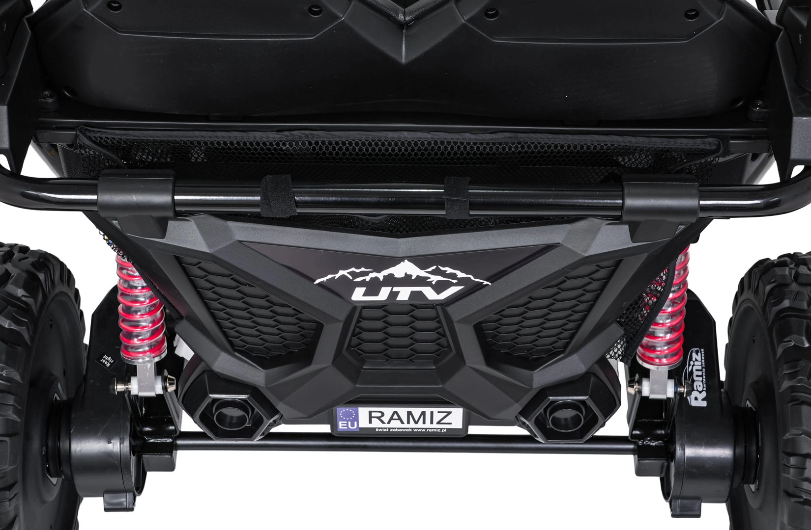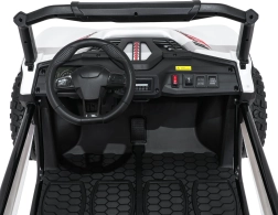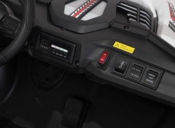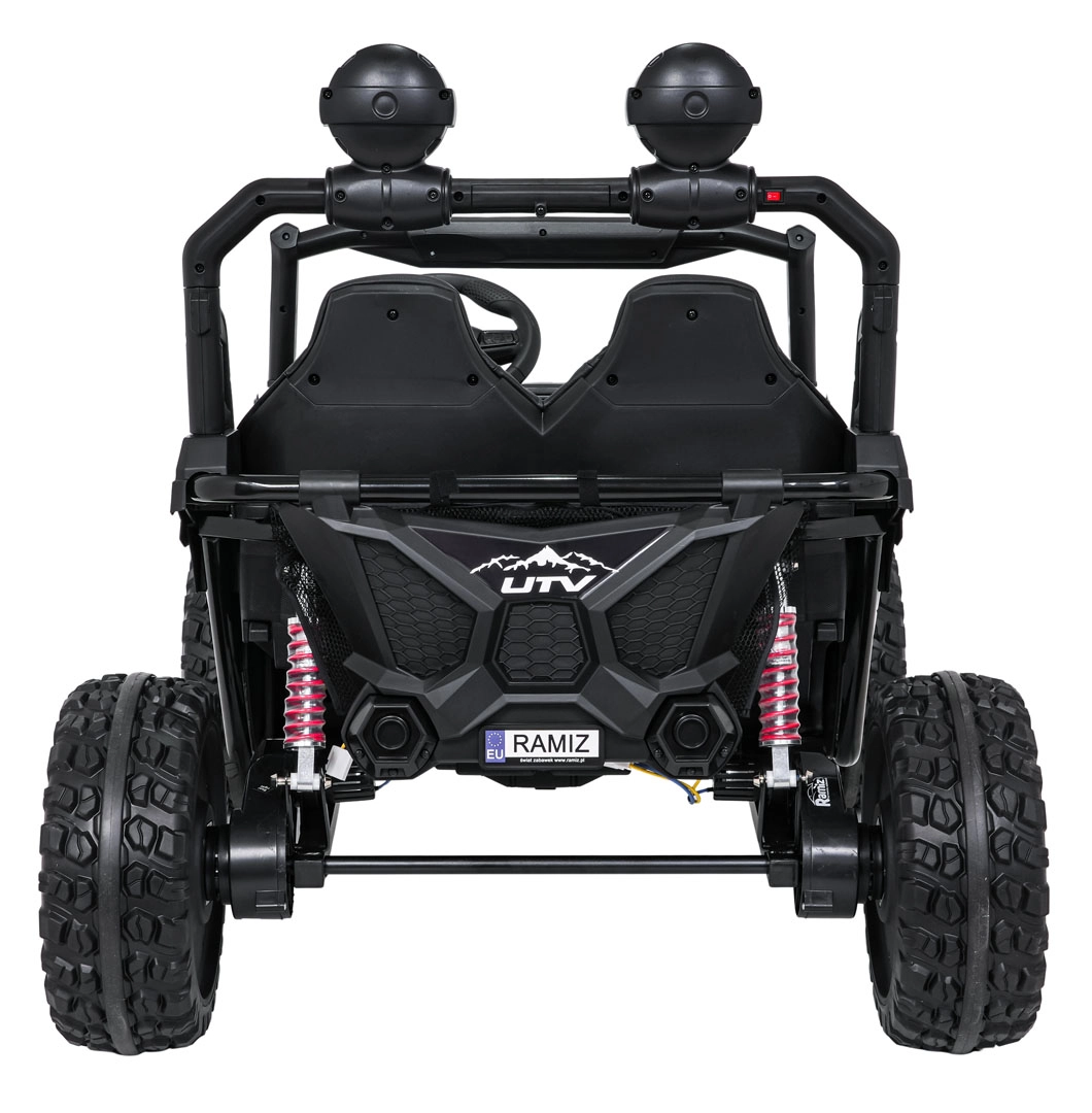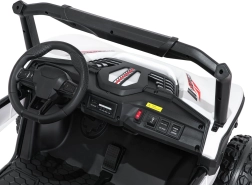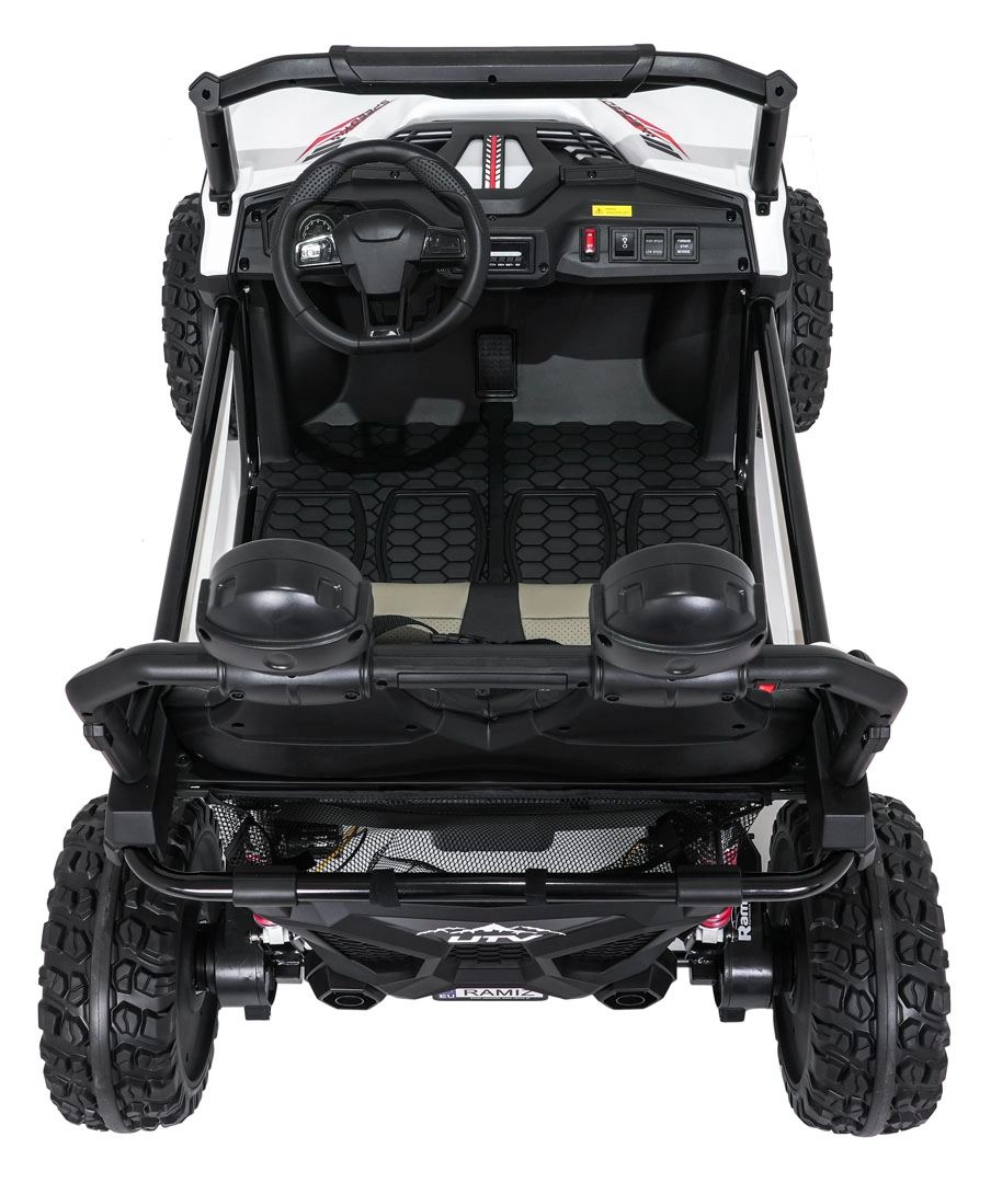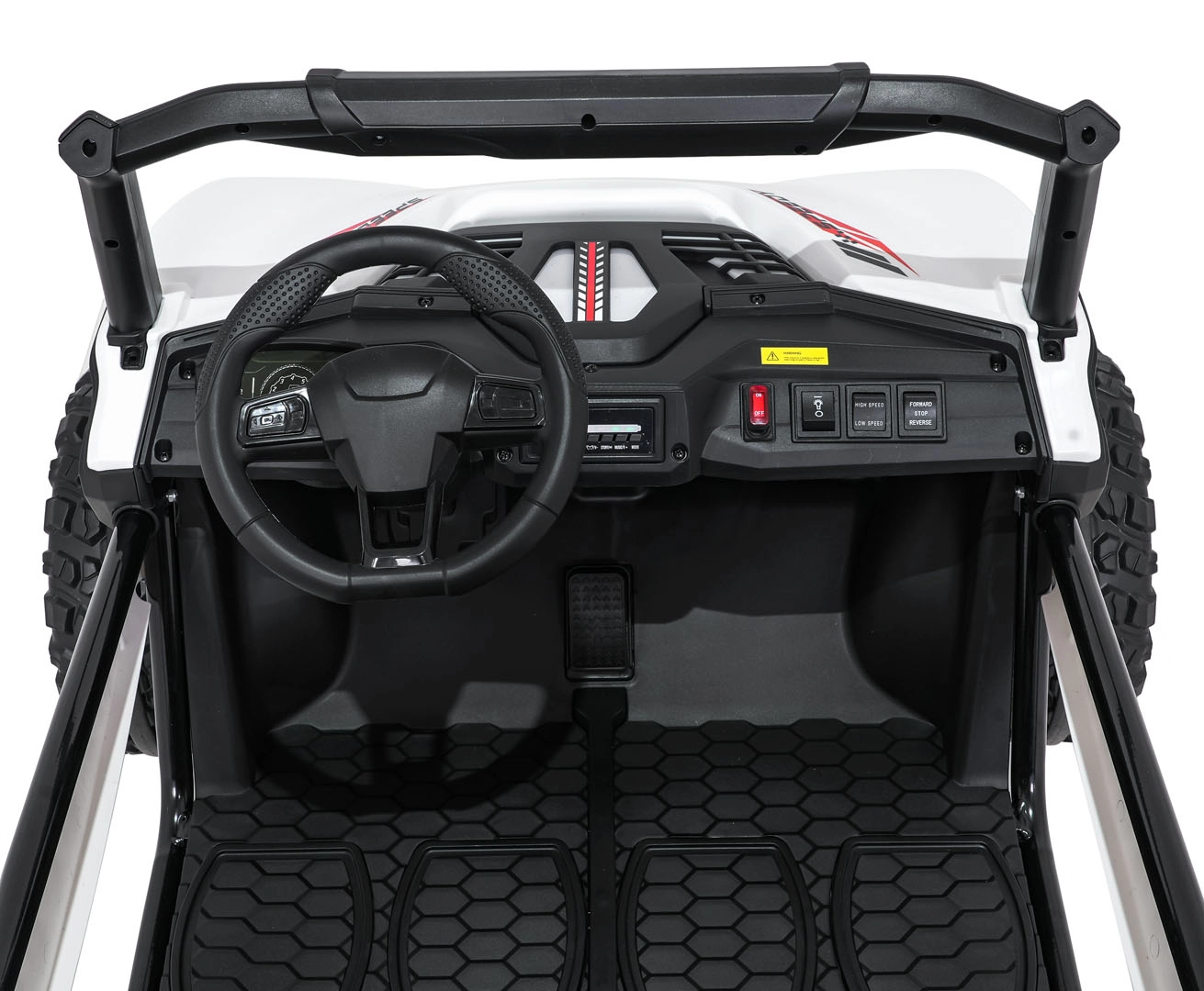 Veiligheid en comfort staan voorop: de ruime dubbele zitting van ecoleer met gordels biedt veilige zitplaats voor twee kinderen, de koplamp met LED-effect en de verlichte grille verhogen de zichtbaarheid. Ouders hebben alles onder controle dankzij de 2,4GHz afstandsbediening met 3 snelheden en Emergency Stop-functie. Het audiopaneel biedt MP3, AUX, USB en Bluetooth, inclusief claxon en melodieën op het stuur.