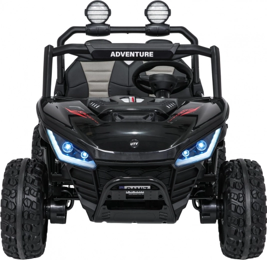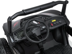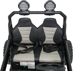 Robuuste elektrische kinderauto met 4x4-aandrijving, dubbele zetel van eco-leer en grote EVA-wielen voor offroad. Uitgerust met krachtige motoren 4×200 W, 24V voeding, LED-verlichting en een uitgebreid audiopaneel met Bluetooth/USB/MP3. Inclusief 2,4 GHz afstandsbediening met noodknop Stop voor maximale oudercontrole.