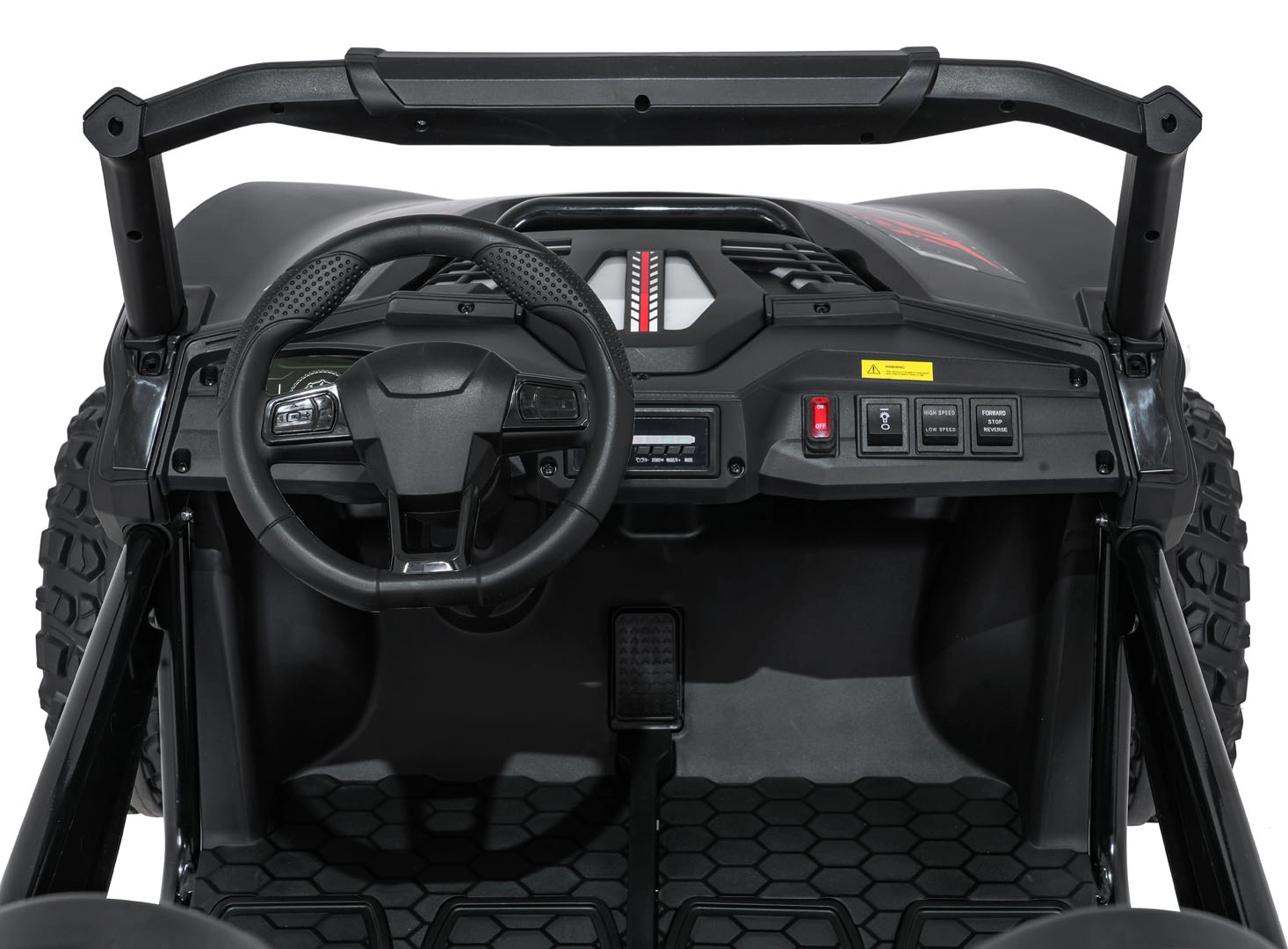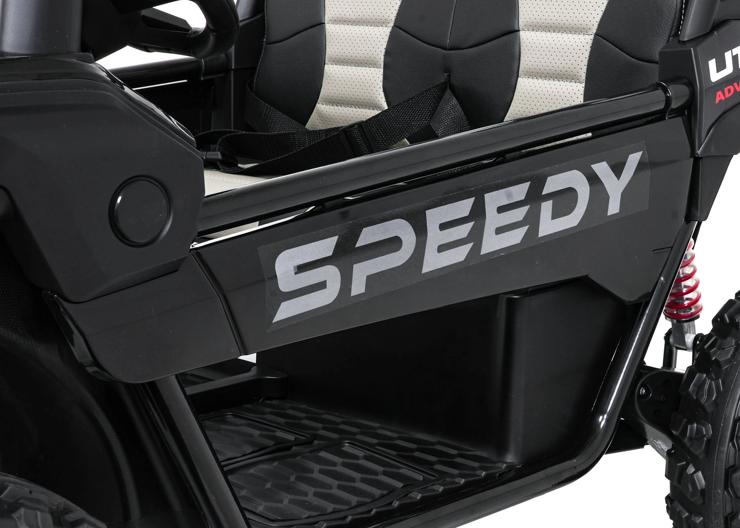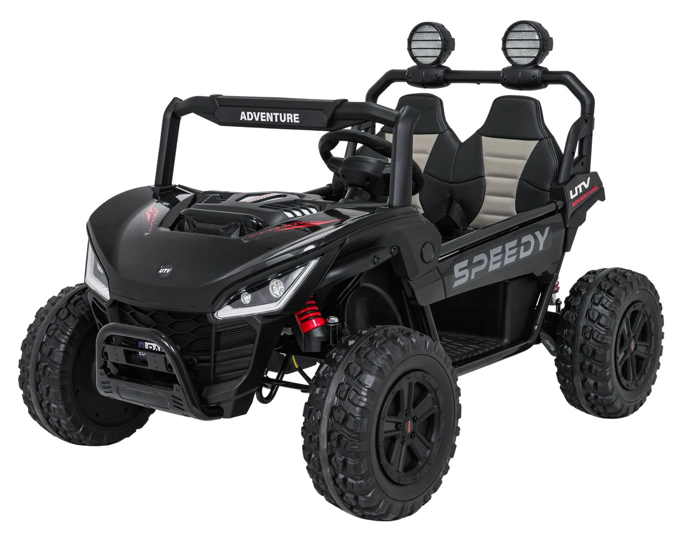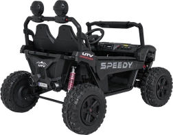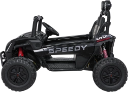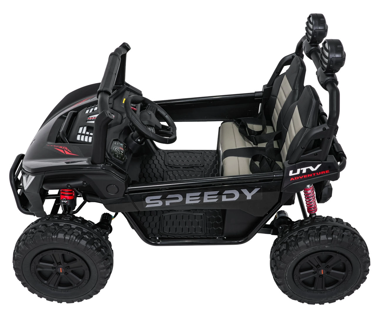 Zoek je een duurzaam en veilig kinder voertuig dat ook zwaarder terrein aankan? Deze SPEEDY 4x4 buggy blinkt uit door de combinatie van prestaties en comfort: vier motoren van 200 W (totaal 800 W) in 24 V serie, grote EVA-schuimwielen 31×12 cm, hoge bodemvrijheid van 19 cm en achterste verstelbare schokdempers voor een soepele rit. Twee zitplaatsen met veiligheidsgordels voor broer/zus of vriendje.