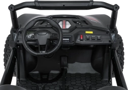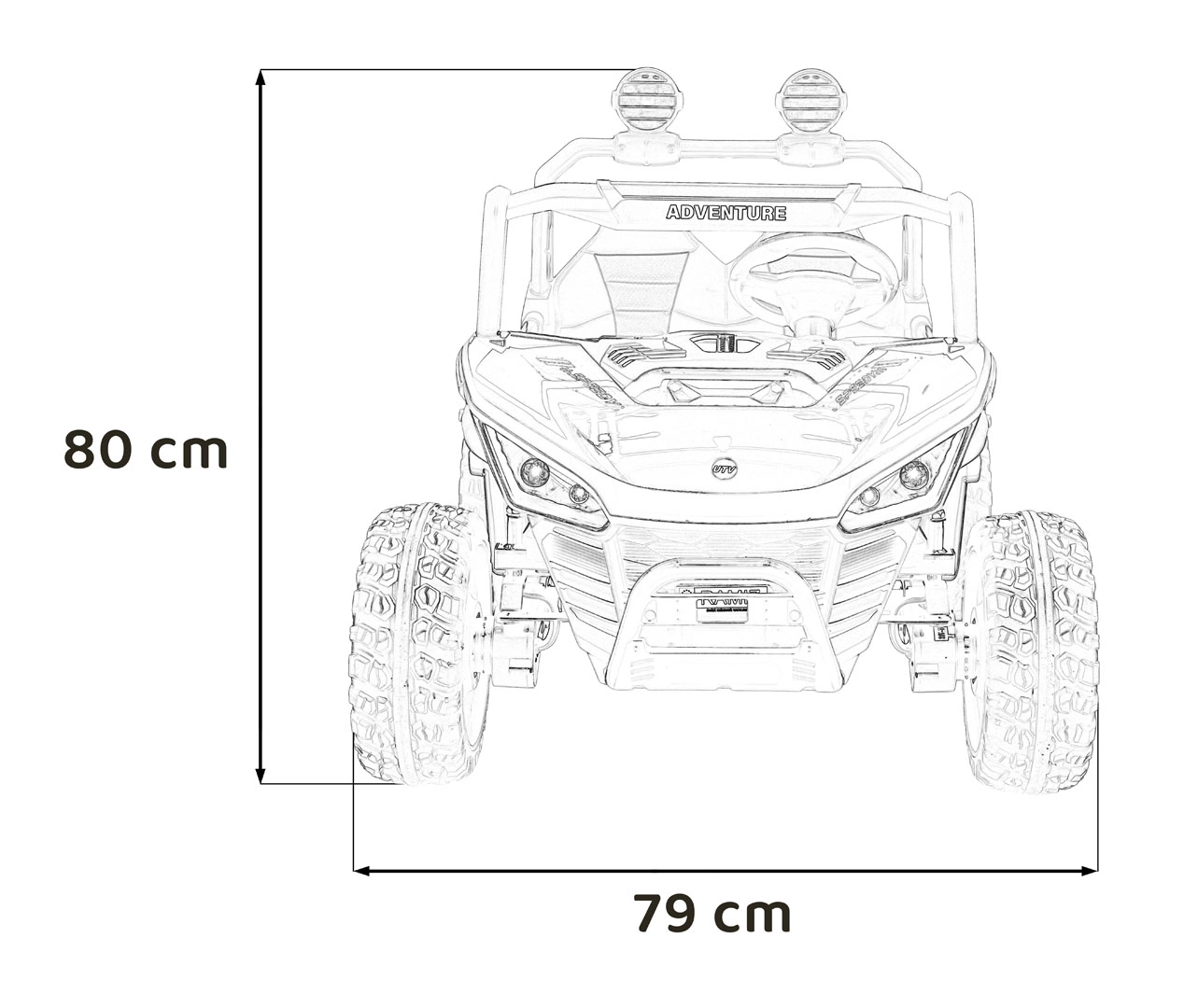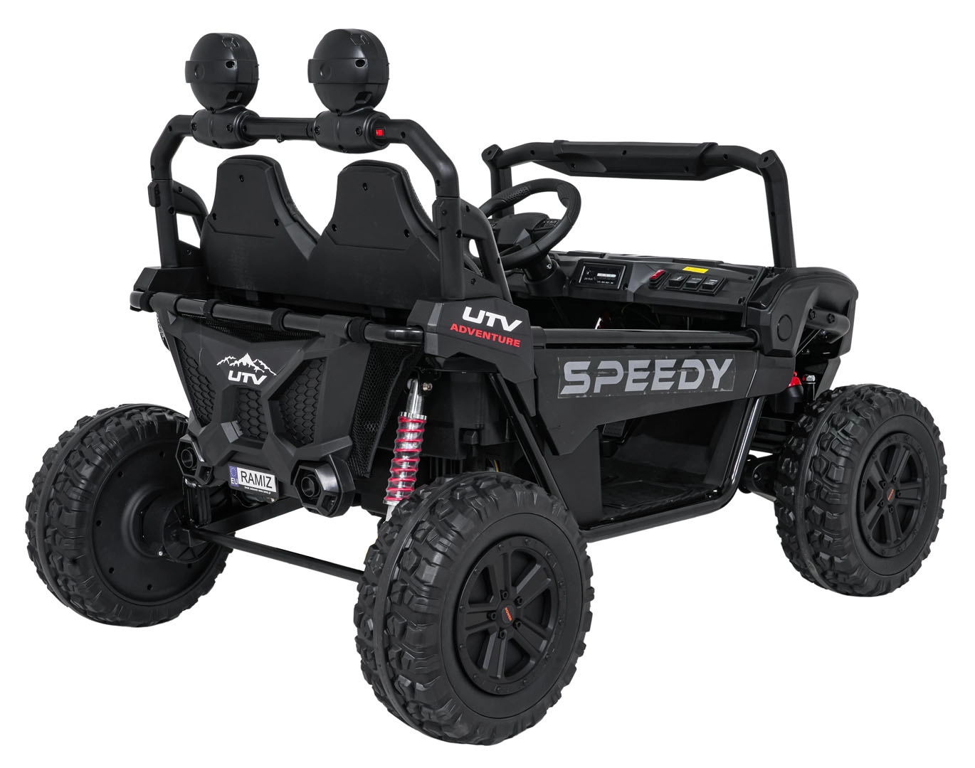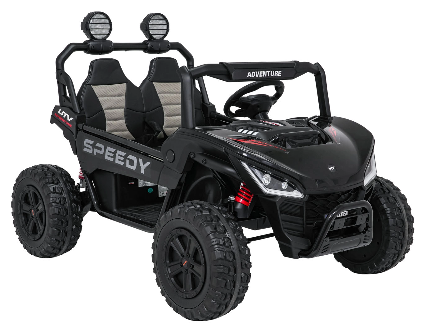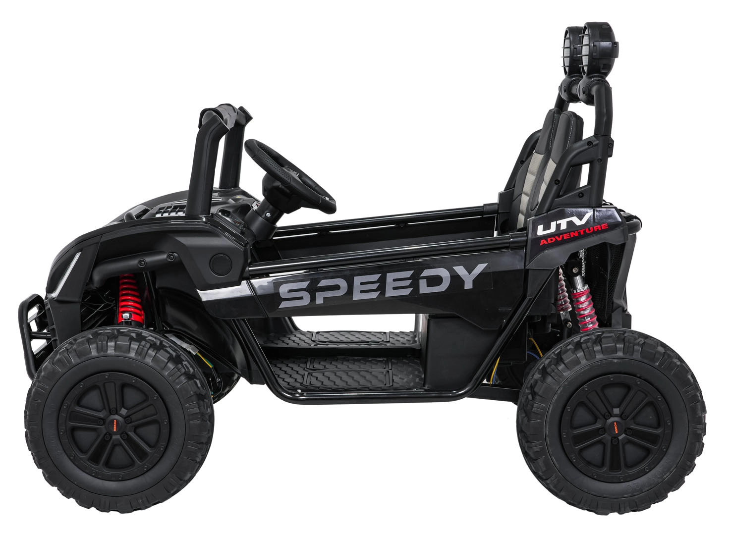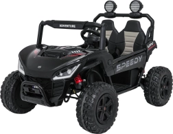 Zoek je een duurzaam en veilig kinder voertuig dat ook zwaarder terrein aankan? Deze SPEEDY 4x4 buggy blinkt uit door de combinatie van prestaties en comfort: vier motoren van 200 W (totaal 800 W) in 24 V serie, grote EVA-schuimwielen 31×12 cm, hoge bodemvrijheid van 19 cm en achterste verstelbare schokdempers voor een soepele rit. Twee zitplaatsen met veiligheidsgordels voor broer/zus of vriendje.