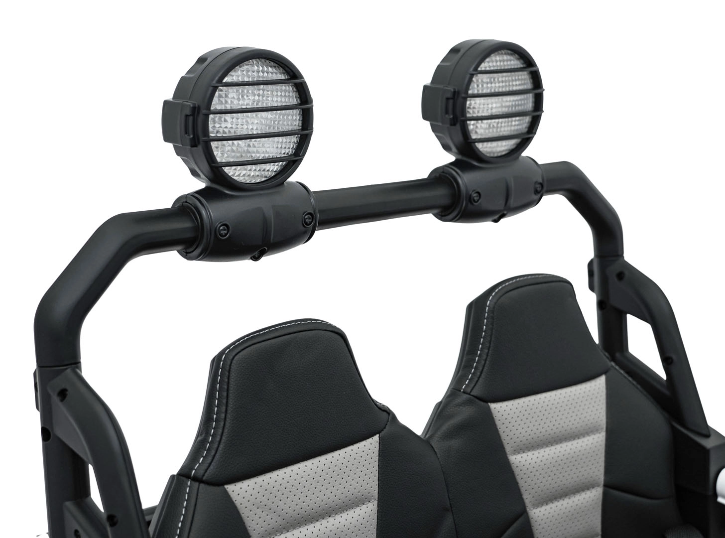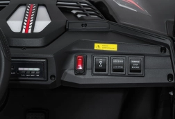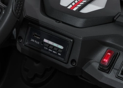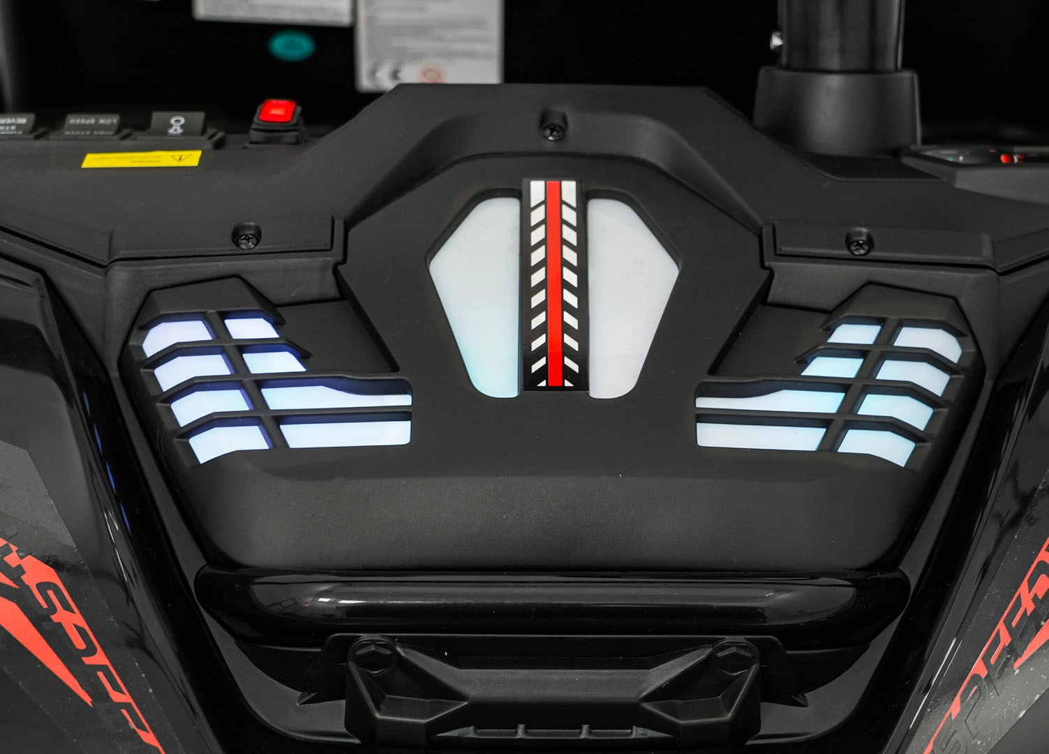 Voor veilig plezier zijn er een soepele start, achteruit en twee snelheden, ook schakelbaar via de 2,4 GHz afstandsbediening met drie snelheden en Stop-knop. De lichtshow wordt verzorgd door LED-koplampen, een verlichte motorkap en een bovenste lichtboog (op batterijen – niet inbegrepen). Het audiopaneel biedt MP3, Bluetooth, USB en AUX; op het stuur zitten geluiden en claxon en vooraf ingestelde melodieën.