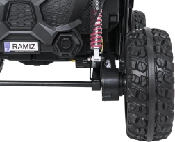 Grote EVA-wielen 31×12 cm maken geen lawaai, dempen uitstekend oneffenheden en kunnen niet lek raken. Achterste, verstelbare schokdempers verhogen stabiliteit en comfort op onverharde wegen.