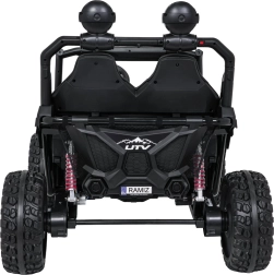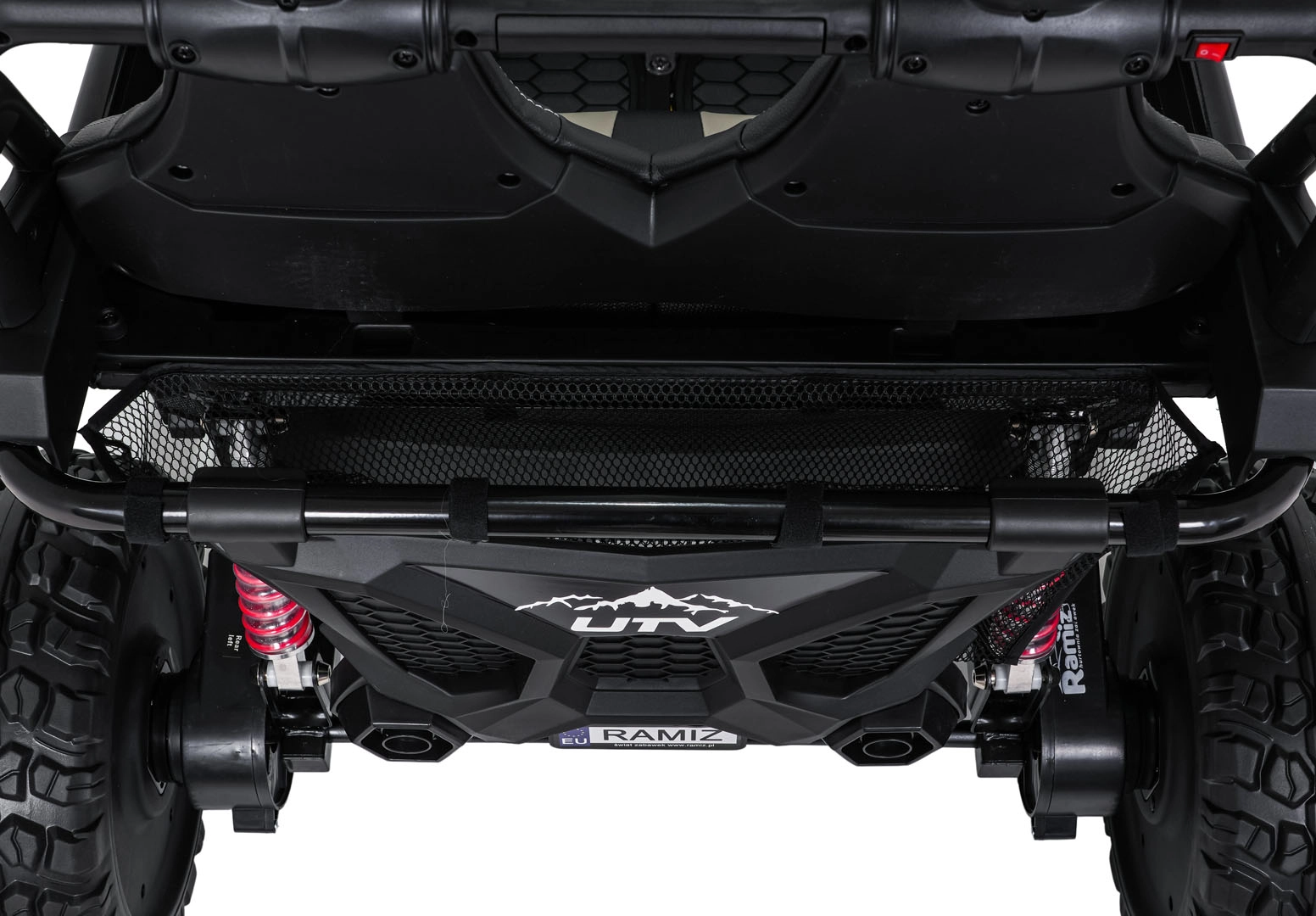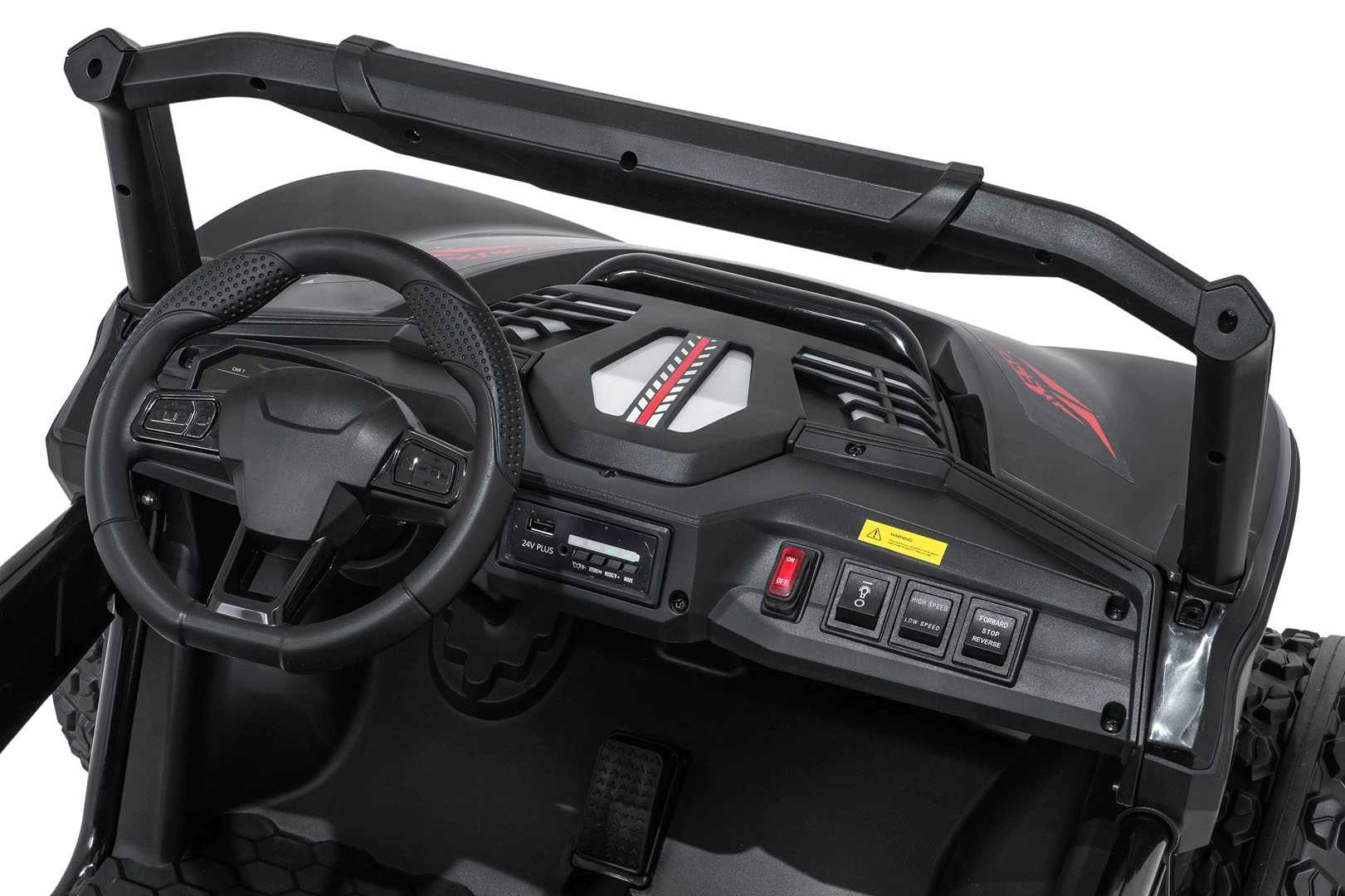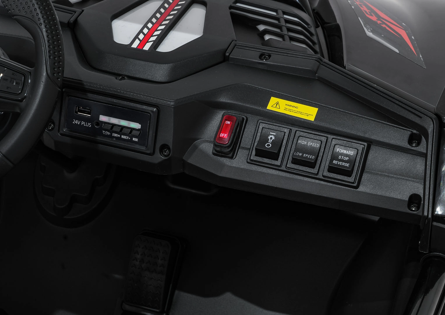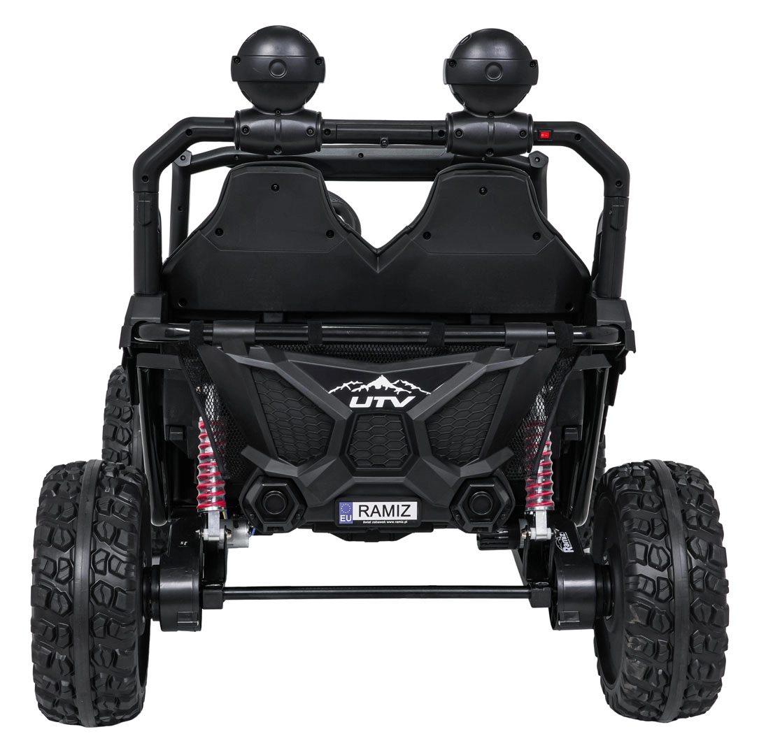 De 2,4 GHz afstandsbediening met 3 snelheden en Stop-knop laat ouders de rit volledig onder controle houden. De dubbele zetel met veiligheidsgordels houdt kinderen stevig en veilig op hun plek.