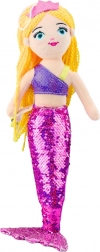 De pluchen zeemeermin heeft lang, geel krullend haar en een roze kroon. De paarse glinsterende top maakt het esthetische, sprookjesachtige karakter compleet, ideaal niet alleen als speelgoed maar ook als decoratie voor de kinderkamer.
