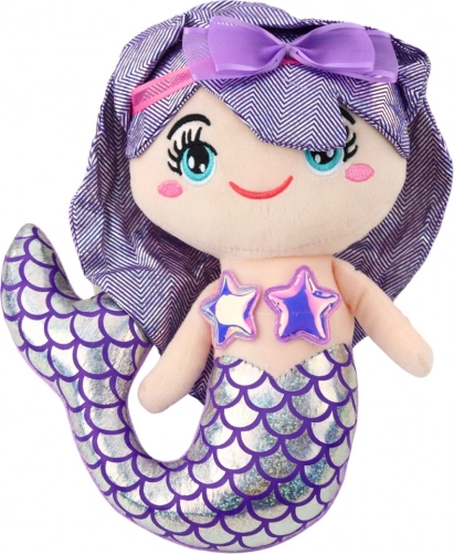 Deze mooie paarse zeemeermin is ideaal voor de kleintjes dankzij haar sprookjesachtige uiterlijk en aangenaam materiaal. De staart is bedekt met stof die vissen schubben nabootst in paarse en parelmoer tinten, haar haar is versierd met een grote paarse strik.