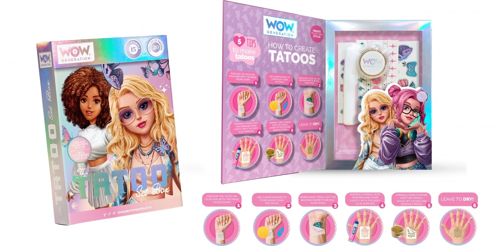 - Creatieve sjablonen: Drie vellen sjablonen met vrolijke motieven die inspireren en het maken van je eigen tatoeageontwerpen vereenvoudigen.