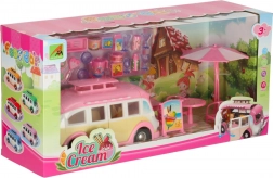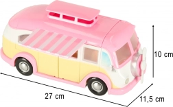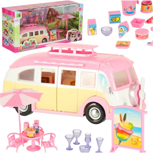Deze schattige ijscowagen in roze-crèmekleuren verandert elke kamer in een klein bistro op wielen. Kinderen kunnen het dak en de deuren openen, de luifel uitschuiven en klanten bedienen aan het tafeltje met parasol. Realistische interieurdetails stimuleren creatieve verhalen en urenlang speelplezier.