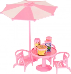 Tafel, stoeltjes en parasol creëren een knus plekje voor gasten. Ideaal voor het serveren van ijs en drankjes.