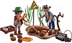 Ontdek oude geheimen met de spannende PLAYMOBIL-opgraafset! Verstop fossielen zoals ammonieten, trilobieten en dinosaurus-eieren in de rotsen en ontdek ze opnieuw met realistische tools. Analyseer je vondsten zorgvuldig met penselen, een hamertje en een loep, en berg ze veilig op in de houten kist. Met de meegeleverde camera kunnen de paleontologen elke spannende vondst documenteren. De gedetailleerde basisplaat met struiken en takken nodigt uit tot eindeloos fantasierijk onderzoek. Met het liefdevolle PLAYMOBIL-design wordt elke opgraving een avontuur in het verleden!