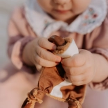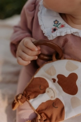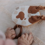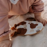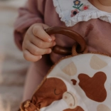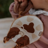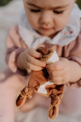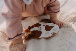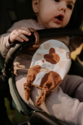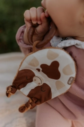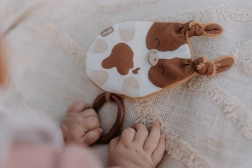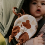 Gemaakt van hoogwaardige materialen, biedt het speeltje Kalfje vele interessante elementen die de zintuigen van uw kleintjes ontwikkelen. Het gezicht is gemaakt van 100% katoenen stof met opdruk, voorzien van een certificaat voor kinderen tot 3 jaar. De achterkant van bamboefleece biedt een zachte en aangename oppervlakte.
