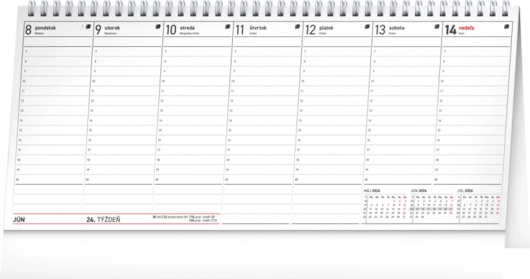 Burea(kalender) voor managers met een kolomindeling die alle belastingdeadlines, Slowaakse namen, feestdagen en gedenkdagen bevat, en een overzicht van drie maanden voor elke week.