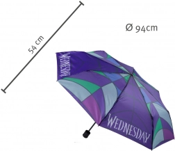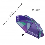 Stijlvolle opvouwbare paraplu met een donker elegant Wednesday-motief is ideaal voor in de rugzak of handtas. Compact ontwerp maakt eenvoudig dragen en betrouwbare bescherming tegen regen mogelijk.