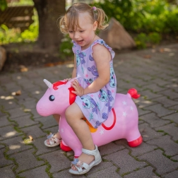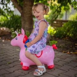 De roze springeenhoorn van Woopie is een speelkameraad voor actief spelen, zowel binnen als buiten. Dankzij de comfortabele handgrepen in de vorm van oortjes en de brede, antislippootjes is het rijden stabiel en veilig. De kleurrijke manen, witte hoorn en sterrenmotief stimuleren de verbeelding en veranderen elk moment in een leuk avontuur.