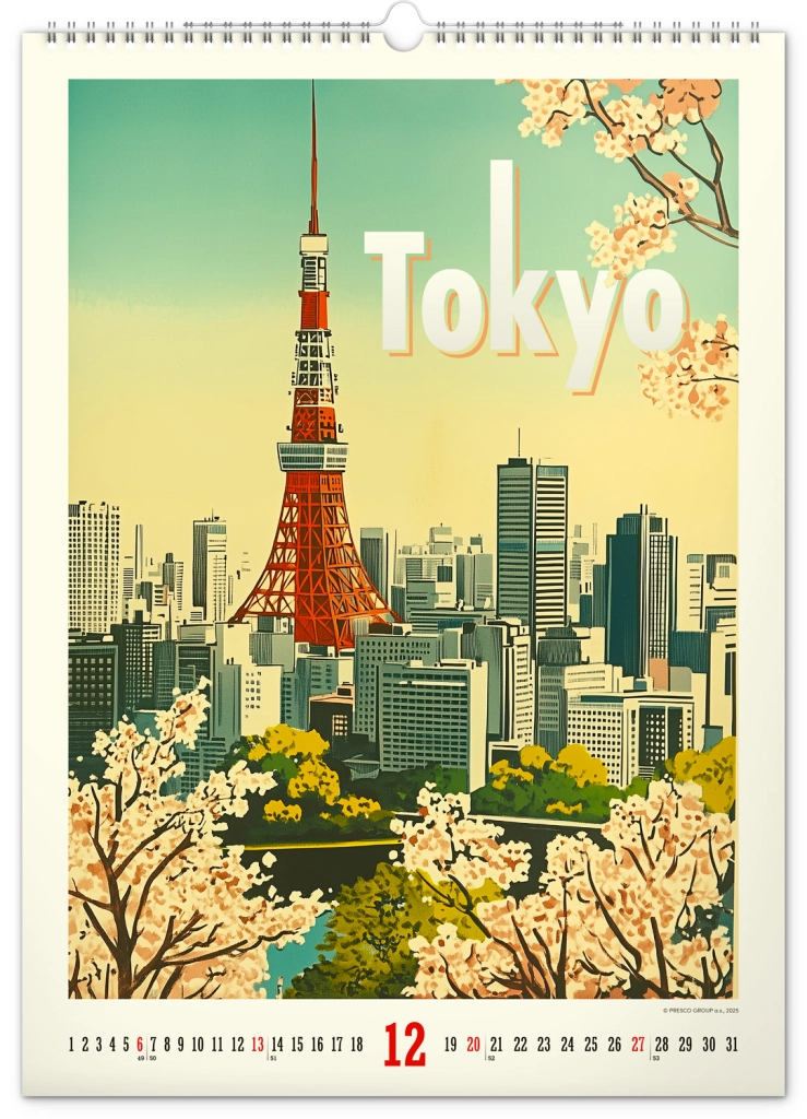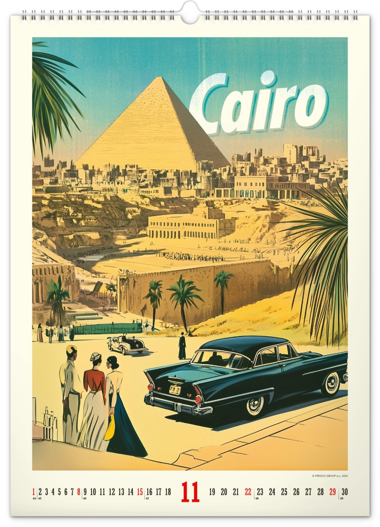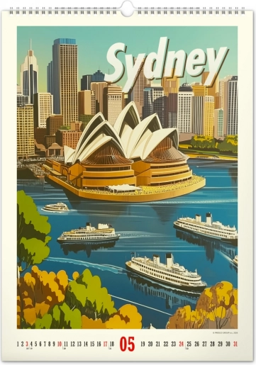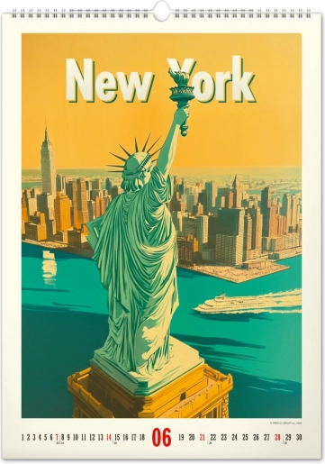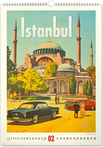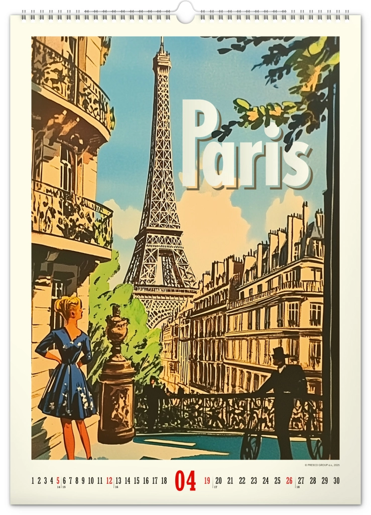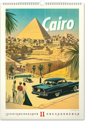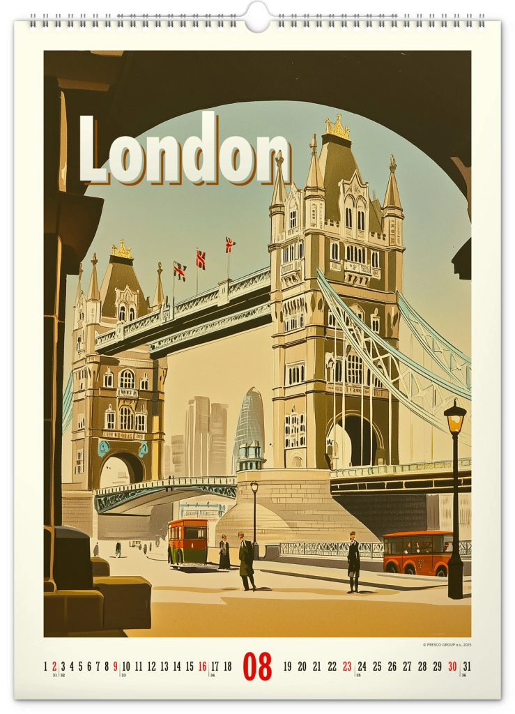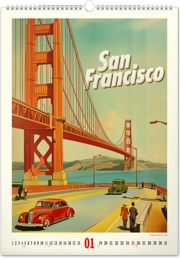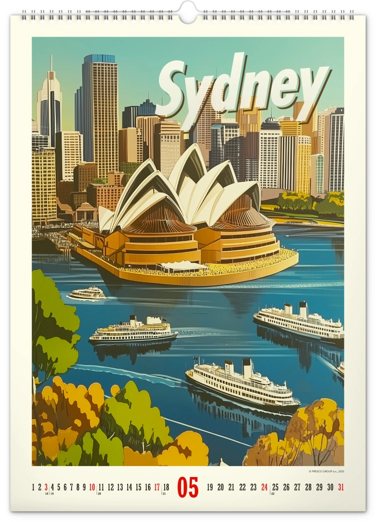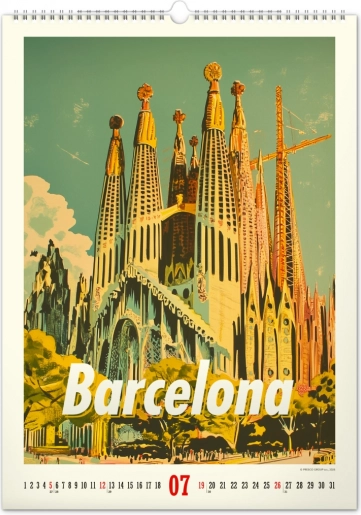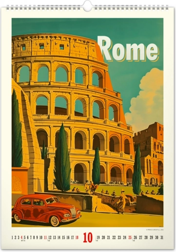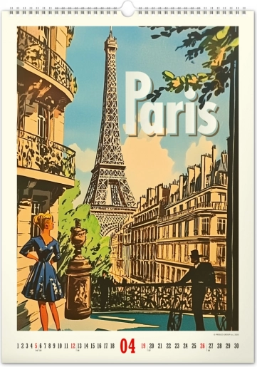 Ontdek de nostalgie van vervlogen decennia met een wandkalender vol vintage posters van wereldsteden, die de sfeer van uw huis tot leven brengt.