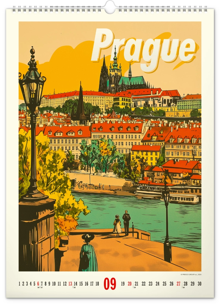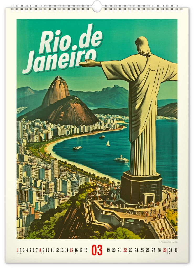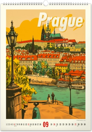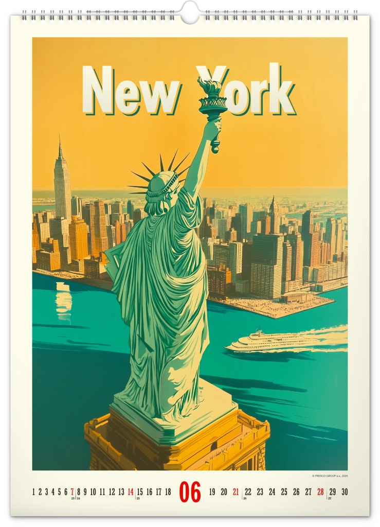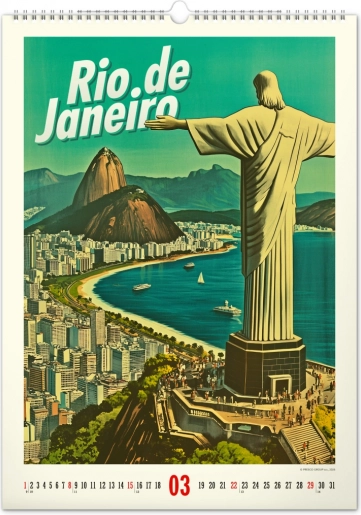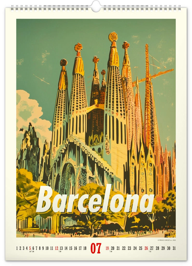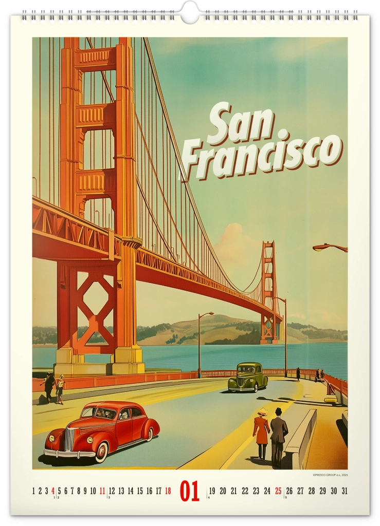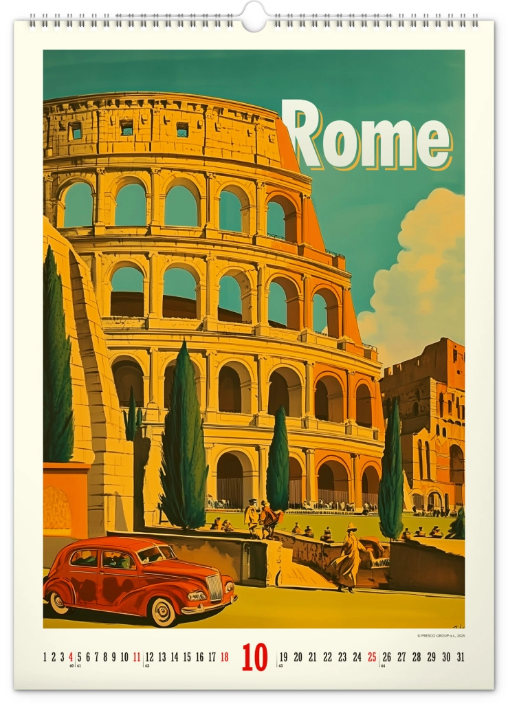 Ontdek de nostalgie van vervlogen decennia met een wandkalender vol vintage posters van wereldsteden, die de sfeer van uw huis tot leven brengt.
