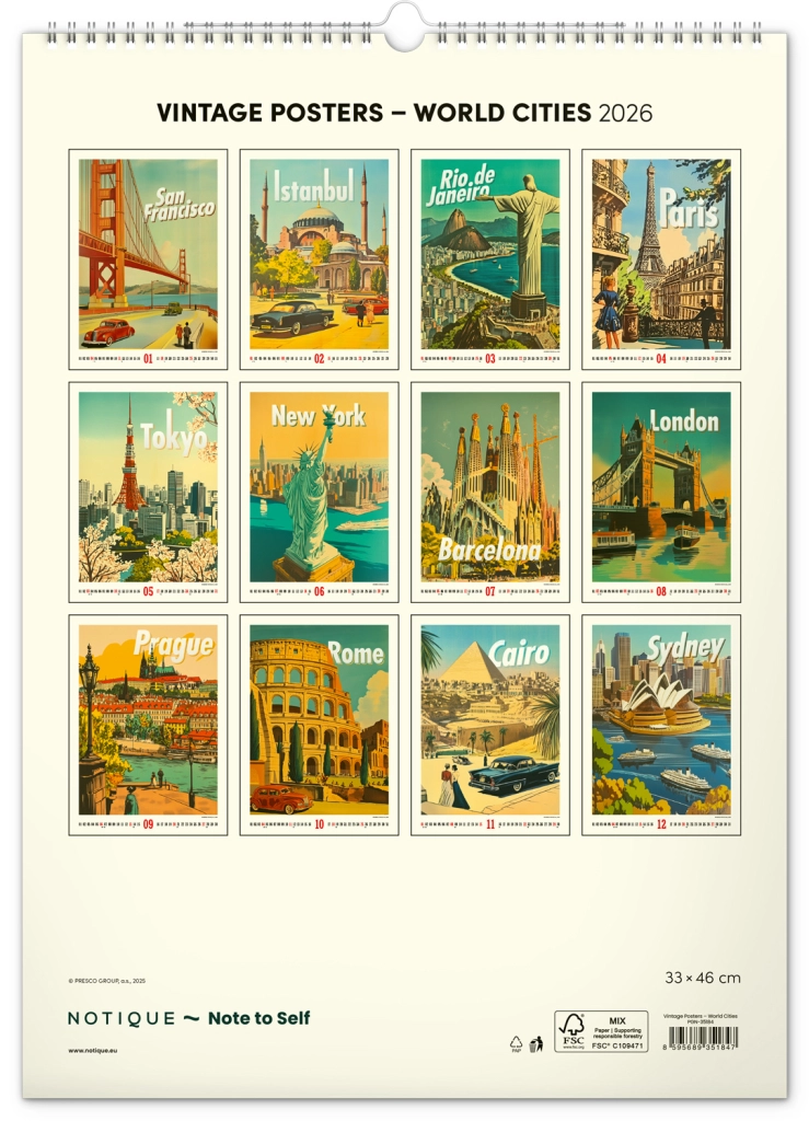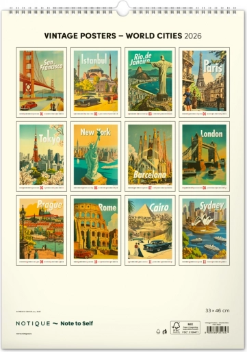 Vintage posters van wereldsteden in kalender 2026, 33 x 46 cm. Nostalgische decoratie voor uw huis.