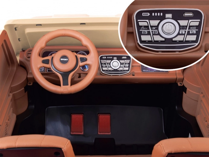 Het multimediapaneel biedt motorgeluiden bij het starten, een schommelmodus (auto beweegt voor-/achteruit), lichteffecten (koplampen en richtingaanwijzers), Engelstalige verhaaltjes en vrolijke liedjes, een D/R-schakelaar voor de rijrichting en ook een USB-ingang voor eigen muziek. Op het stuur zitten de claxon en bediening voor de nummers.