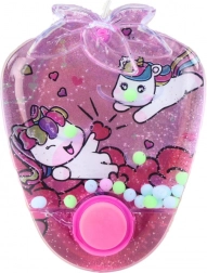 Dit waterspel met een betoverend eenhoornmotief is een klassieke speelgoedhit die al vele jaren kinderen van verschillende leeftijden blij maakt. Dankzij het compacte formaat en het eenvoudige mechanisme is het ideaal voor onderweg, naar school of tijdens een wandeling. Het spel bestaat uit het indrukken van een knop, die de kleurrijke ringetjes of balletjes in de met vloeistof gevulde transparante behuizing in beweging brengt. Het doel is om deze elementen op pinnetjes of in de daarvoor bestemde vakjes te plaatsen.
