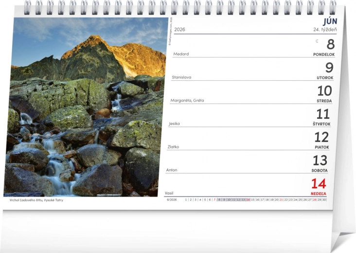 Ontdek de prachtige uitzichten van het Slowaakse landschap met de bureaukalender voor 2026, met een wekelijkse kalender met namen, feestdagen en gedenkdagen in het Slowaaks.