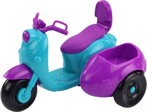 De pop rijdt op een driewielige scooter in een intense turquoise-paars kleur. De aanhanger aan de zijkant van de scooter herbergt een klein hondje met een rode halsband – een trouwe metgezel op elke reis. De set is gemaakt van duurzaam, veilig plastic, ideaal voor dagelijks spelen.