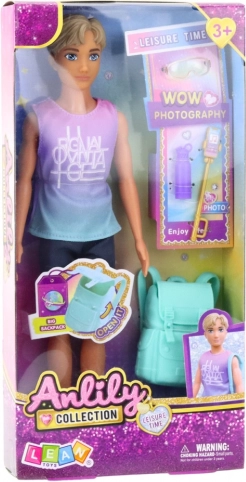 De jongenspop van Anlily is een stijlvolle en leuke speelgoedpop voor jonge avonturiers. Hij draagt een sportieve set bestaande uit een kleurrijk mouwloos T‑shirt, een donkere korte broek en witte sportschoenen. De look wordt aangevuld met een praktische rugzak.