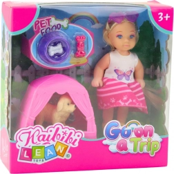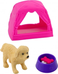De set bevat een kleine hond – de trouwe metgezel van de pop – die verzorging, voeding en een plek om te rusten nodig heeft. Speciaal voor hem is er een roze tent die als hondenhok dient – ideaal om te rusten, spelen of slapen. In de set zit ook een bakje met een bot en een snack voor realistische speelscènes.