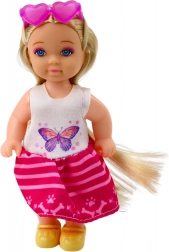 Deze schattige set brengt kinderen naar een wereld van zorgzame aandacht en speelse pret met huisdieren. De pop van 12 cm is gekleed in een kleurrijke outfit: een wit T-shirt met vlinderprint, een roze rokje met pootafdrukken en gele schoenen. De pop draagt roze hartvormige brillen die haar een opvallend karakter geven.