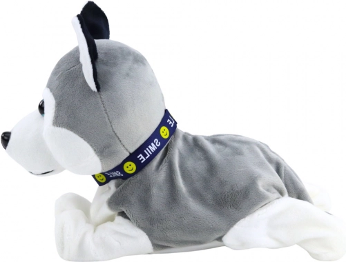 De interactieve pluchen huskyhond is het perfecte speelgoed voor kinderen en combineert een schattige look met realistische functies. De hond is gemaakt van zachte, comfortabele pluche in witte en grijze tinten, en zijn vriendelijke uitdrukking en blauwe ogen trekken de aandacht van de allerkleinsten. Om de nek draagt hij een decoratieve lint met het opschrift 'SMILE' en emoticons, wat de hond extra karakter geeft.