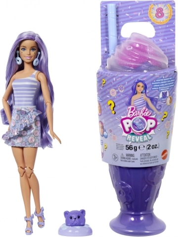 Ontdek de magische wereld van verrassingen met de Barbie Pop Reveal in een paarse uitvoering. In de snoepgeïnspireerde beker wachten 8 verrassingen: een geurende pop, stijlvolle accessoires, een squishy huisdiertje, een bedje en een kleurenverandering van de make-up met koud/warm water. Een geweldig cadeau voor kinderen vanaf 3 jaar.