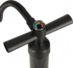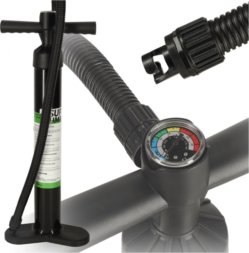 Handmatige SUP-pomp met geïntegreerde manometer voor nauwkeurige drukcontrole en comfortabel pompen dankzij het comfortabele T-handvat.