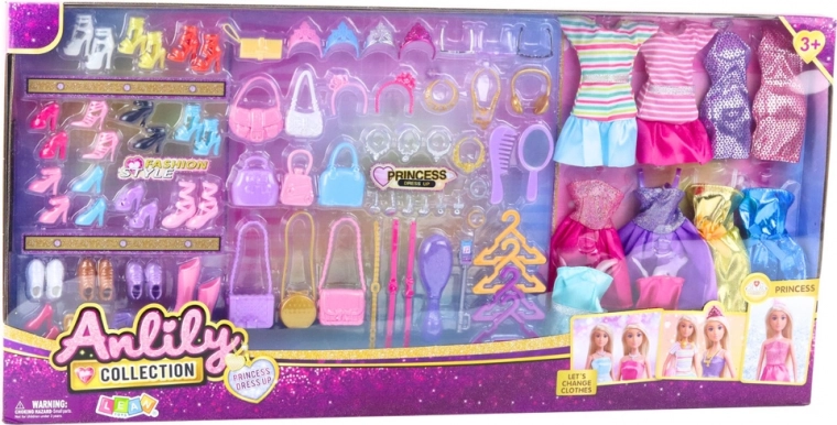 Uitgebreide modieuze set van het merk Anlily is een ideale keuze voor elk kind dat van mode en creatieve spelletjes met poppen houdt. Dit rijke pakket bevat 10 unieke jurken, 18 paar verschillende schoenen en een breed scala aan accessoires zoals handtassen en sieraden.