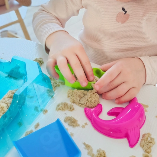 Kinetisch zand is zacht, prettig om aan te raken, houdt goed vorm, droogt niet uit en plakt niet aan de handen – ideaal voor zintuiglijk spel voor kinderen vanaf 3 jaar.