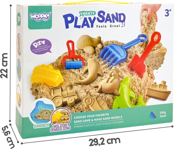 Met deze WOOPIE kinetisch zand set kunnen kinderen leuke vormen maken – van dieren tot voertuigen. Het zand is zelfhechtend, houdt zijn vorm, droogt niet uit en is ideaal voor zintuiglijk spel thuis aan tafel. Lichte hulpmiddelen zijn ook voor kleine kinderhanden goed te gebruiken.