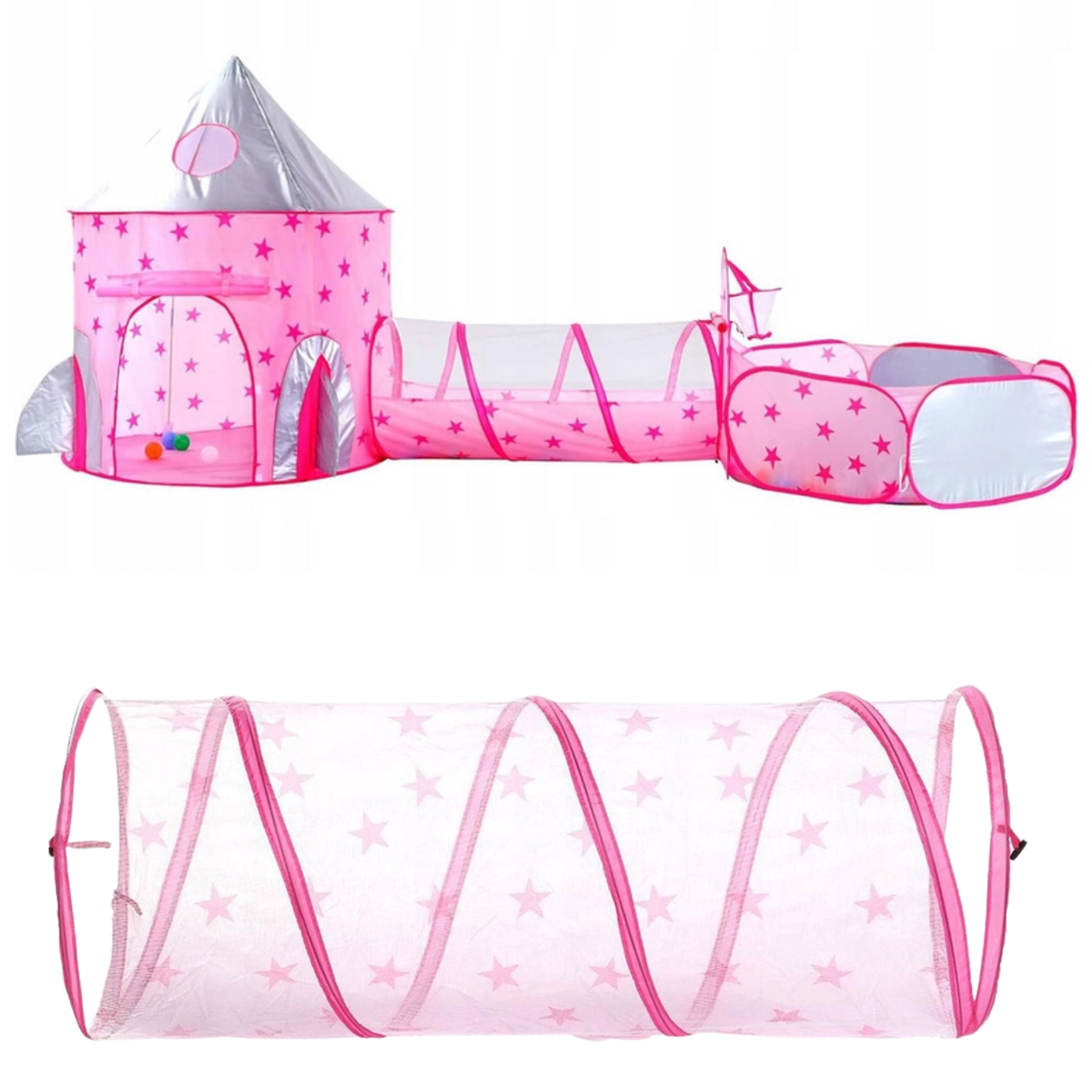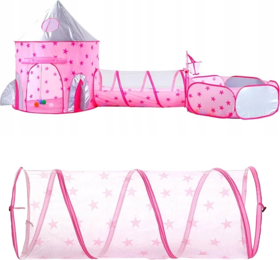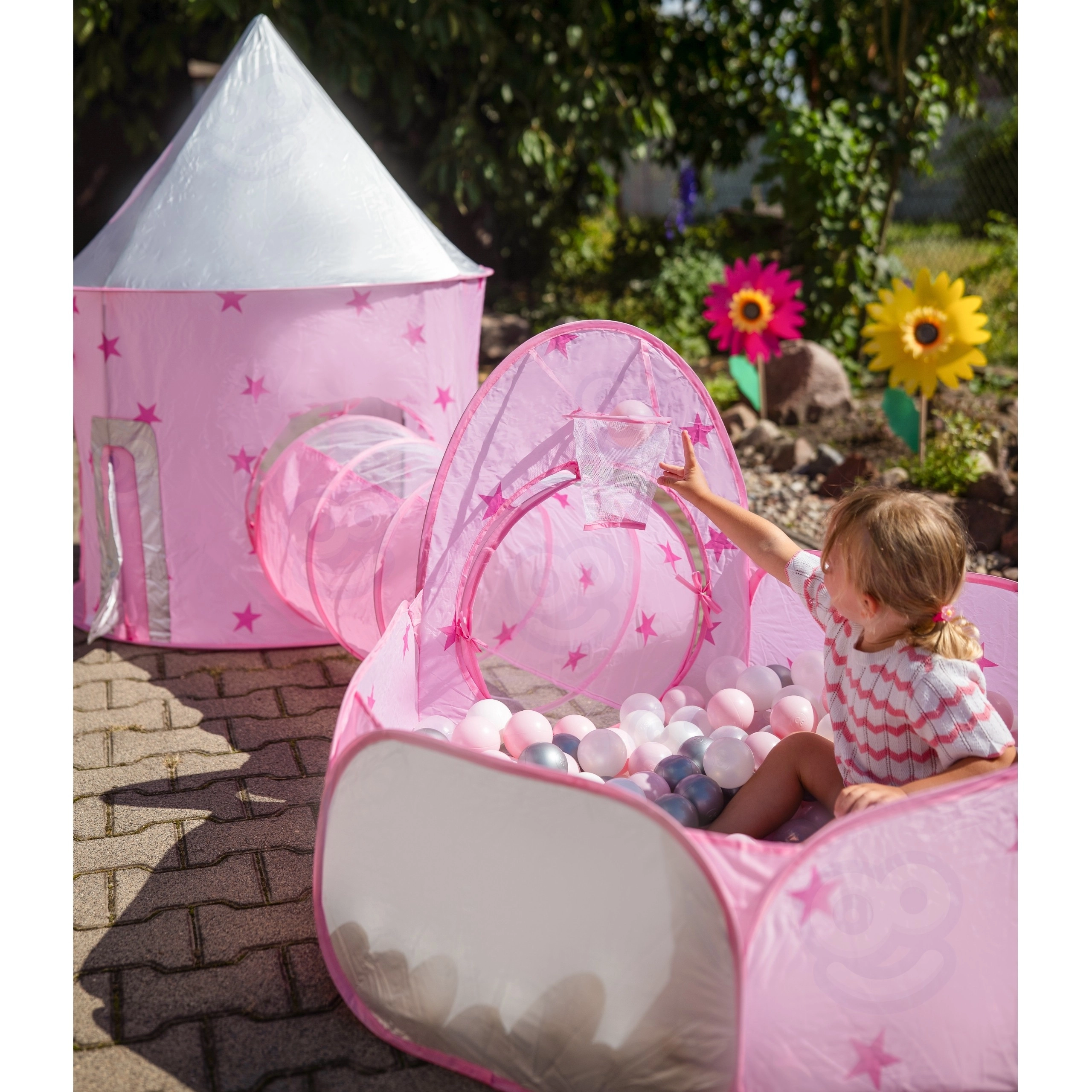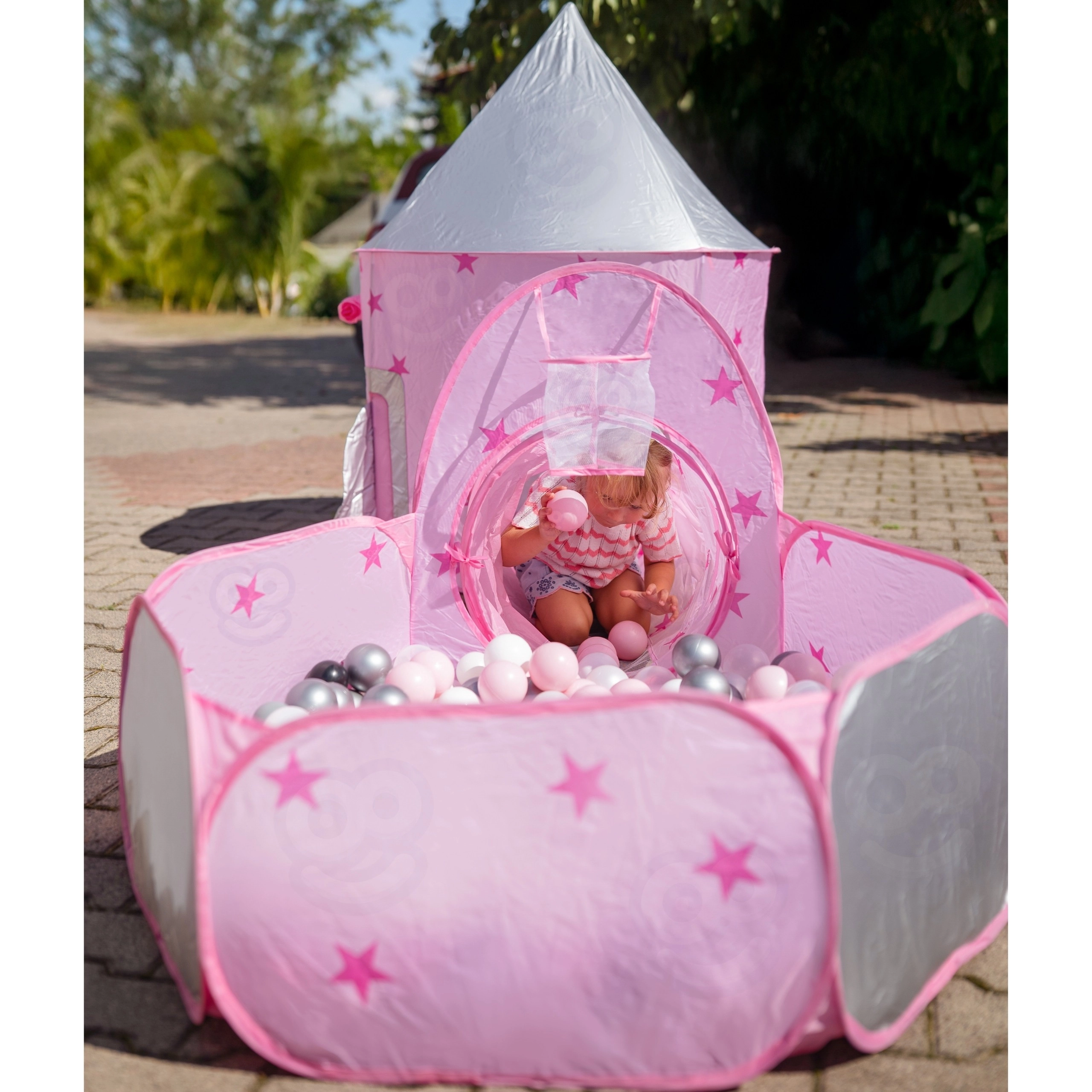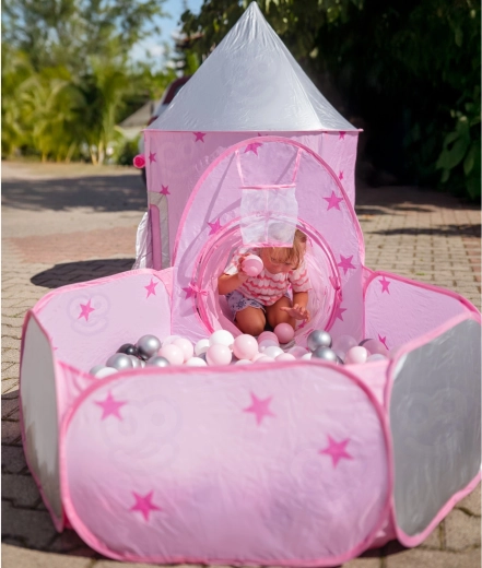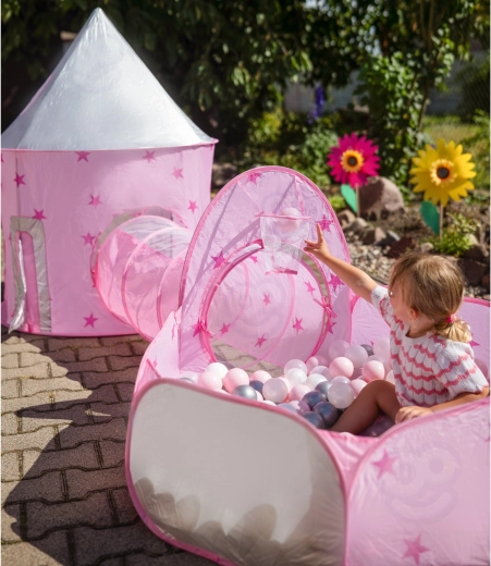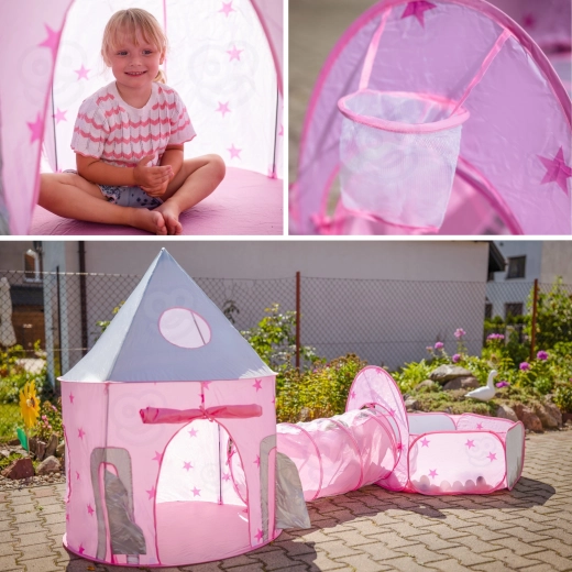 Het pronkstuk van de set is de roze tent die op een paleis lijkt, met gaasraampjes en oprolbare deurtjes. De perfecte schuilplaats voor kleine prinsessen en ridders en het middelpunt van hun fantasiespel.