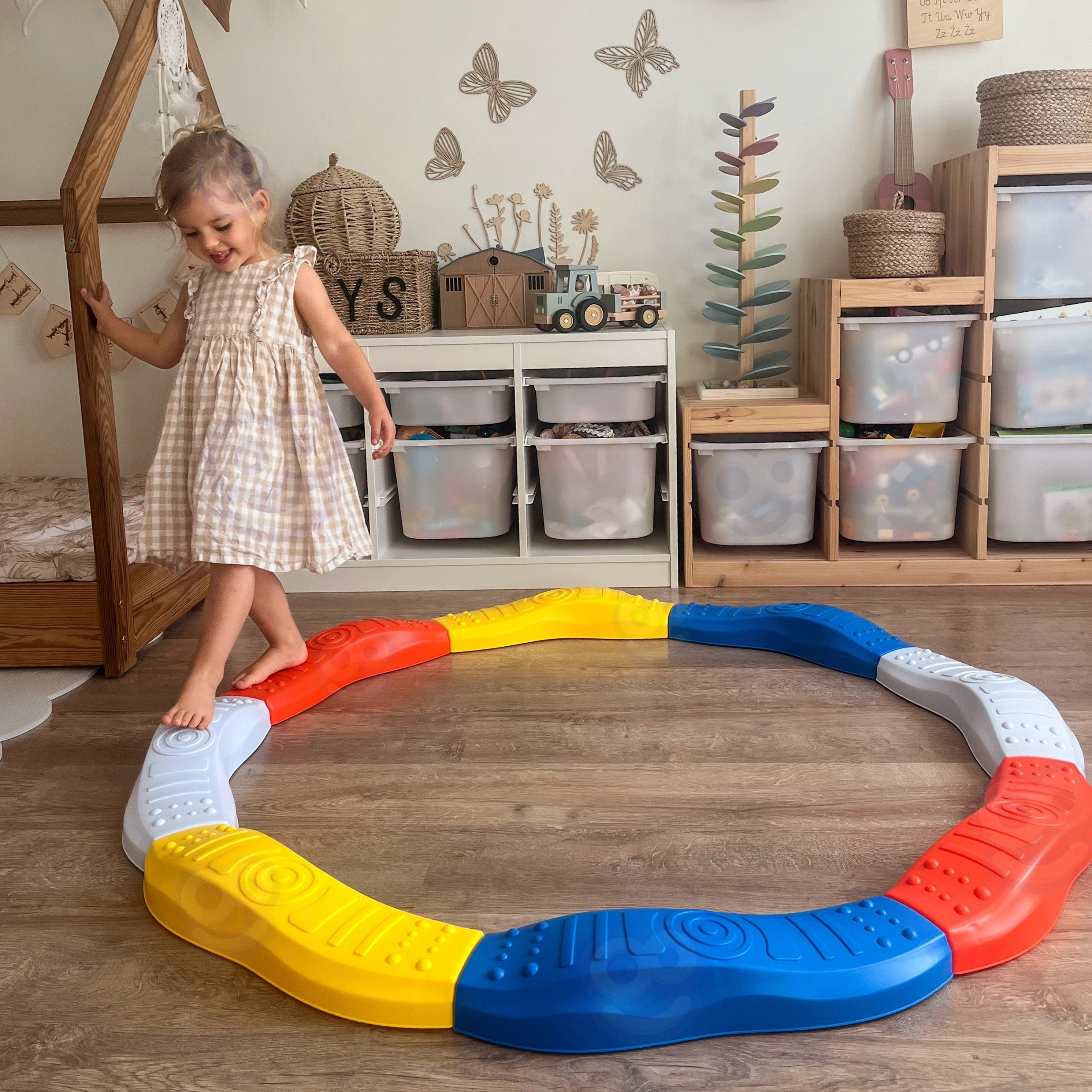 De modulaire Woopie-baan is ontworpen voor de natuurlijke ontwikkeling van kinderen vanaf 3 jaar. Het getextureerde oppervlak met nopjes en groeven stimuleert de receptoren in de voeten, ondersteunt een correcte lichaamshouding en versterkt de stabiliserende spieren. Gekleurde delen van duurzaam PP blijven veilig op hun plaats dankzij antislipvoetjes en maken snelle veranderingen in de opstelling volgens de fantasie van kinderen mogelijk.