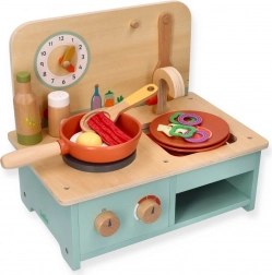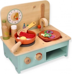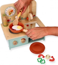 Deze compacte houten keuken biedt kinderen de mogelijkheid om aan rollenspelactiviteiten deel te nemen en hun vaardigheden te ontwikkelen. Ze is speciaal ontworpen voor kinderen vanaf 3 jaar, waardoor ze ideaal is voor kleuters. De keuken is uitgerust met realistische details zoals draaiknoppen en een klok.