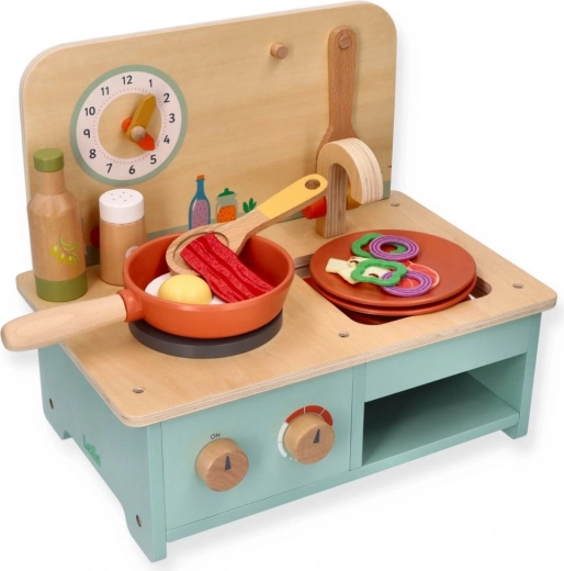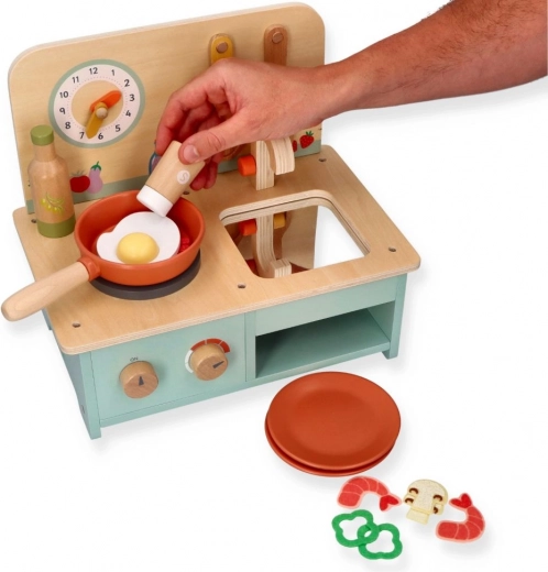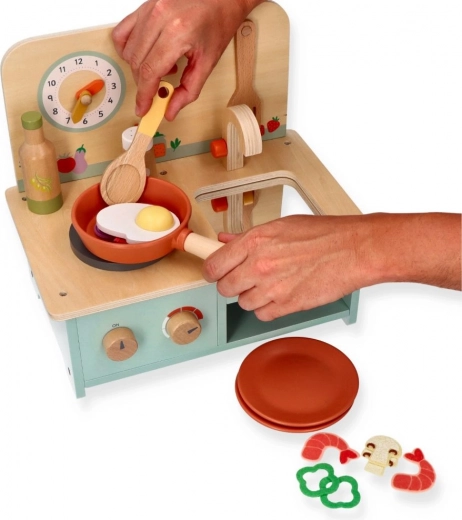 De houten keuken bevat realistische elementen zoals draaiknoppen en een klok, die zorgen voor een authentieke speelervaring.