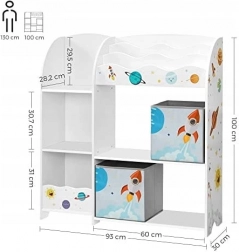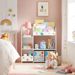 De kinderopbergkast voor speelgoed en boeken is ideaal voor het organiseren van de kinderkamer of speelkamer. Bevat 5 planken voor speelgoed, 3 vakken voor boeken en 2 ruime boxen voor kleine spulletjes. Dankzij de afgeronde randen en de set voor wandbevestiging is hij veilig en geschikt voor elk kind.