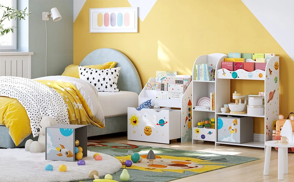 De drie boekenvakken vormen een ideale, open boekenkast die kinderen dagelijks stimuleert om naar hun favoriete verhalen te grijpen. Het ontwerp toont de boekcovers duidelijk, wat nieuwsgierigheid wekt en het makkelijker maakt een specifiek boek te vinden. Deze praktische eigenschap bevordert leesgewoonten en routine vanaf jonge leeftijd.